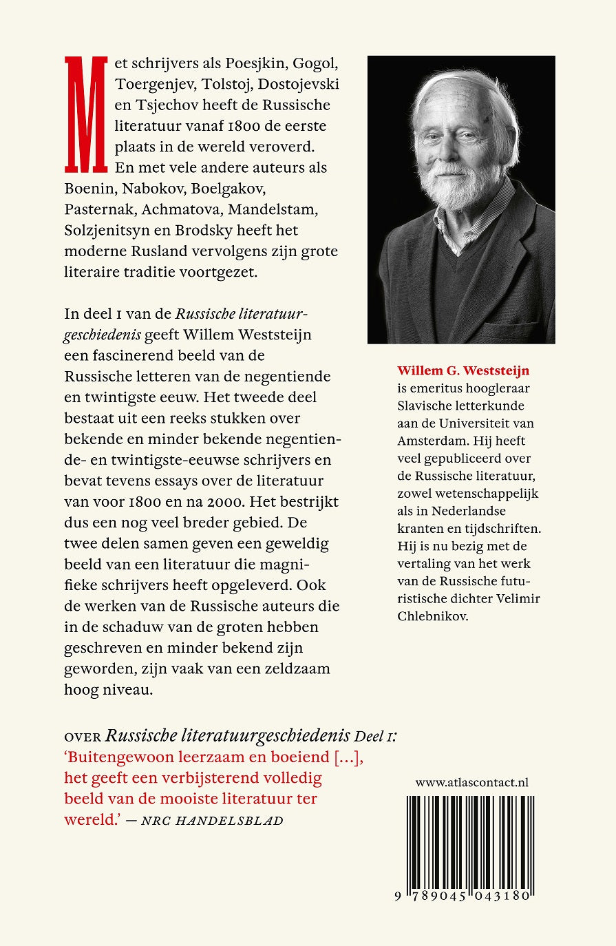 Dit nieuwe, tweede deel van ‘Russische literatuurgeschiedenis’ van Willem Weststeijn laat zien dat de Russische literatuur ook na de groten een rijk aanbod kent. Met schrijvers als Poesjkin, Gogol, Toergenjev, Tolstoj, Dostojevski en Tsjechov heeft de Russische literatuur vanaf 1800 de eerste plaats in de wereld veroverd. En met vele andere auteurs als Boenin, Nabokov, Boelgakov, Pasternak, Achmatova, Mandelstam, Solzjenitsyn en Brodsky heeft het moderne Rusland vervolgens zijn grote literaire traditie voortgezet. In deel 1 van de Russische literatuurgeschiedenis geeft Willem Weststeijn een fascinerend beeld van de Russische letteren van de negentiende en twintigste eeuw. Het tweede deel bestaat uit een reeks stukken over bekende en minder bekende negentiende en twintigste eeuwse schrijvers en bevat tevens essays over de literatuur van voor 1800 en na 2000. Het bestrijkt dus een nog veel breder gebied. De twee delen samen geven een geweldig beeld van een literatuur die magnifieke schrijvers heeft opgeleverd. Ook de werken van de Russische auteurs die in de schaduw van de groten hebben geschreven en minder bekend zijn geworden, zijn vaak van een zeldzaam hoog niveau.