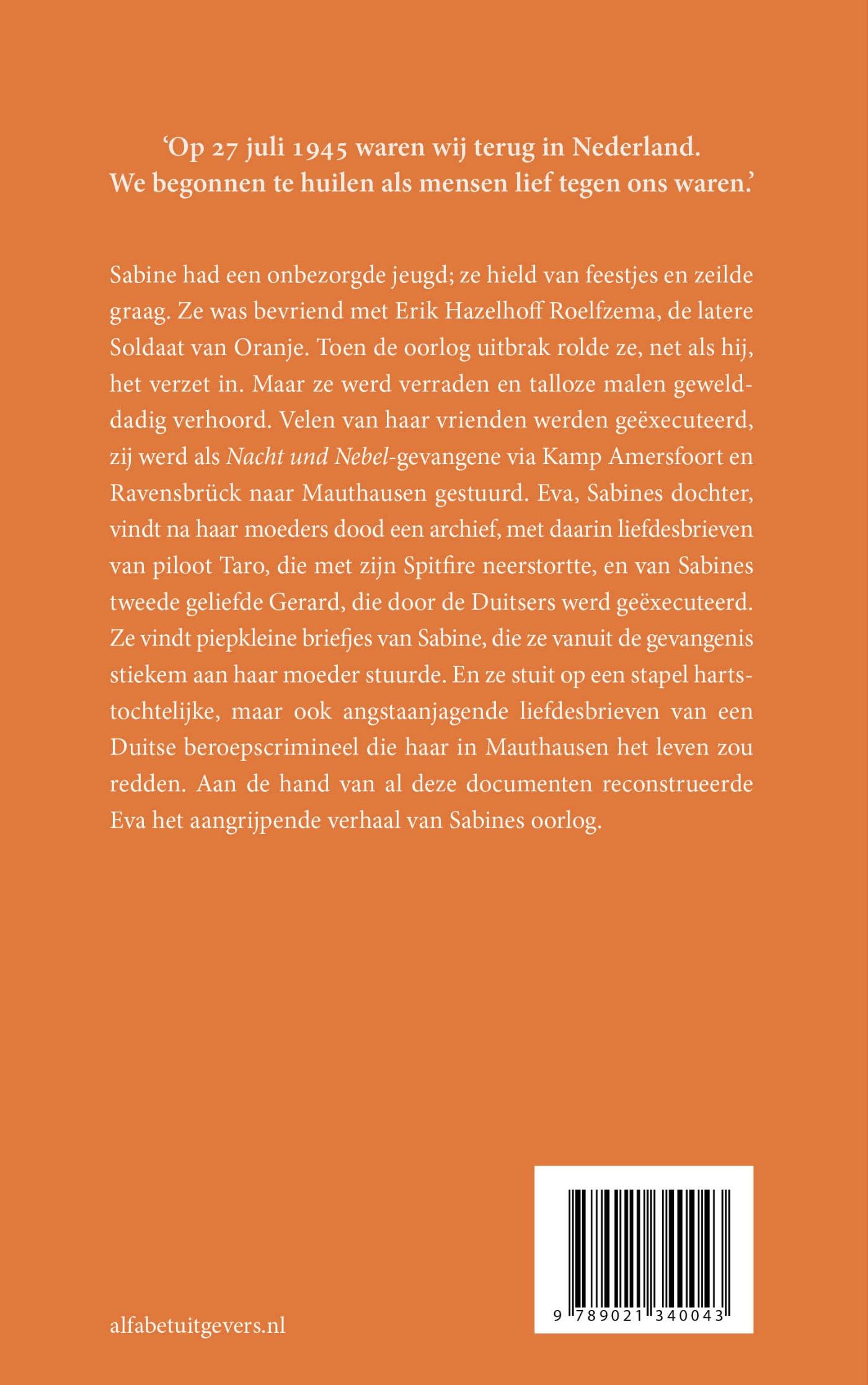 Sabine had een onbezorgde jeugd. Ze hield van feestjes en ze zeilde graag. Ze was bevriend met Erik Hazelhoff Roelfzema, de latere Soldaat van Oranje. Toen de oorlog uitbrak rolde ze het verzet in. Maar ze werd verraden en werd talloze malen gewelddadig verhoord. Via Kamp Amersfoort en Ravensbrück kwam ze de laatste oorlogsmaanden in het gruwelijke Mauthausen terecht. Eva, Sabines dochter, vindt na haar moeders dood een archief, met daarin liefdesbrieven van piloot Taro, die met zijn Spitfire neerstortte, en van Sabines tweede geliefde Gerard, die door de Duitsers werd geëxecuteerd. Ze vindt piepkleine briefjes van Sabine, die ze vanuit de gevangenis stiekem aan haar moeder stuurde. En ze stuit op een stapel hartstochtelijke, maar ook angstaanjagende liefdesbrieven van ene Gebele, een Duitse kapo die in Mauthausen Sabines leven zou redden. Aan de hand van al deze documenten reconstrueerde Eva het nooit eerder vertelde en aangrijpende verhaal van Sabines oorlog.
