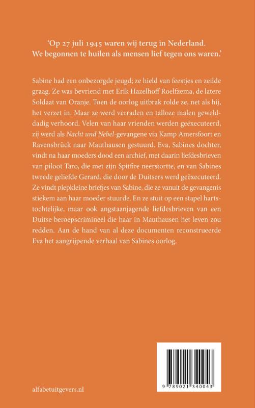 Sabine had een onbezorgde jeugd. Ze hield van feestjes en ze zeilde graag. Ze was bevriend met Erik Hazelhoff Roelfzema, de latere Soldaat van Oranje. Toen de oorlog uitbrak rolde ze het verzet in. Maar ze werd verraden en werd talloze malen gewelddadig verhoord. Via Kamp Amersfoort en Ravensbrück kwam ze de laatste oorlogsmaanden in het gruwelijke Mauthausen terecht. Eva, Sabines dochter, vindt na haar moeders dood een archief, met daarin liefdesbrieven van piloot Taro, die met zijn Spitfire neerstortte, en van Sabines tweede geliefde Gerard, die door de Duitsers werd geëxecuteerd. Ze vindt piepkleine briefjes van Sabine, die ze vanuit de gevangenis stiekem aan haar moeder stuurde. En ze stuit op een stapel hartstochtelijke, maar ook angstaanjagende liefdesbrieven van ene Gebele, een Duitse kapo die in Mauthausen Sabines leven zou redden. Aan de hand van al deze documenten reconstrueerde Eva het nooit eerder vertelde en aangrijpende verhaal van Sabines oorlog.