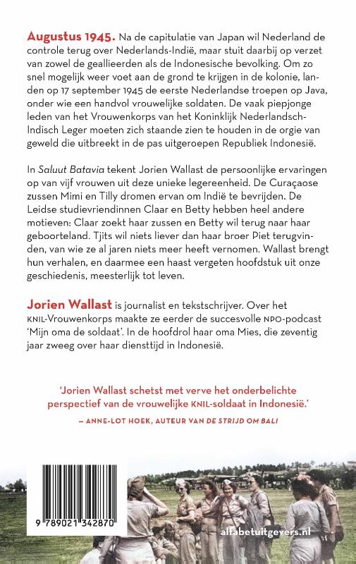 Met groot verteltalent tekent Jorien Wallast in Saluut Batavia de verhalen op van vijf vrouwen die deel uitmaakten van deze ongewapende legereenheid. De Curaçaose zussen Mimi en Tilly dromen van het eigenhandig bevrijden van Indië. De Leidse studievriendinnen Claar en Betty hebben geheel andere motieven: Claar zoekt haar zussen en Betty wil terug naar haar geboorteland. Tjits wil niets liever dan haar broer Piet terugvinden, die voor de oorlog op Sumatra woonde en van wie ze al jaren niets meer heeft vernomen. Wallast brengt hun verhalen, haast vergeten door de geschiedenis, op epische wijze tot leven.