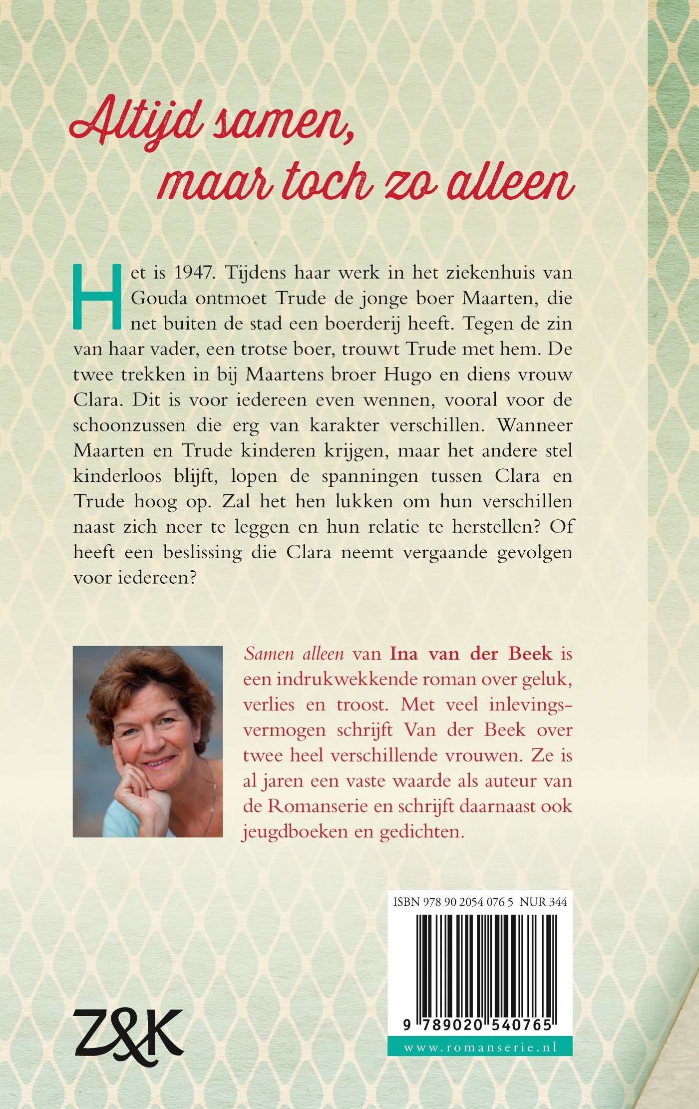 ‘Samen alleen’ van Ina van der Beek is een roman met veel inleveringsvermogen over twee heel verschillende koppels. Het is 1947. Tijdens haar werk in het ziekenhuis van Gouda ontmoet Trude de Bruin de jonge boer Maarten van Zon. Tegen de zin van haar vader, een trotse boer, trouwt Trude met hem. De twee trekken in bij Hugo, Maartens broer, en diens vrouw Clara. Wanneer Maarten en Trude kinderen krijgen, maar het andere stel kinderloos blijft, lopen de spanningen tussen de twee schoonzussen op. Zal het hen lukken om hun verschillen naast zich neer te leggen en hun relatie te herstellen? 'Samen alleen' van Ina van der Beek is een indrukwekkende roman over geluk, verlies en troost.