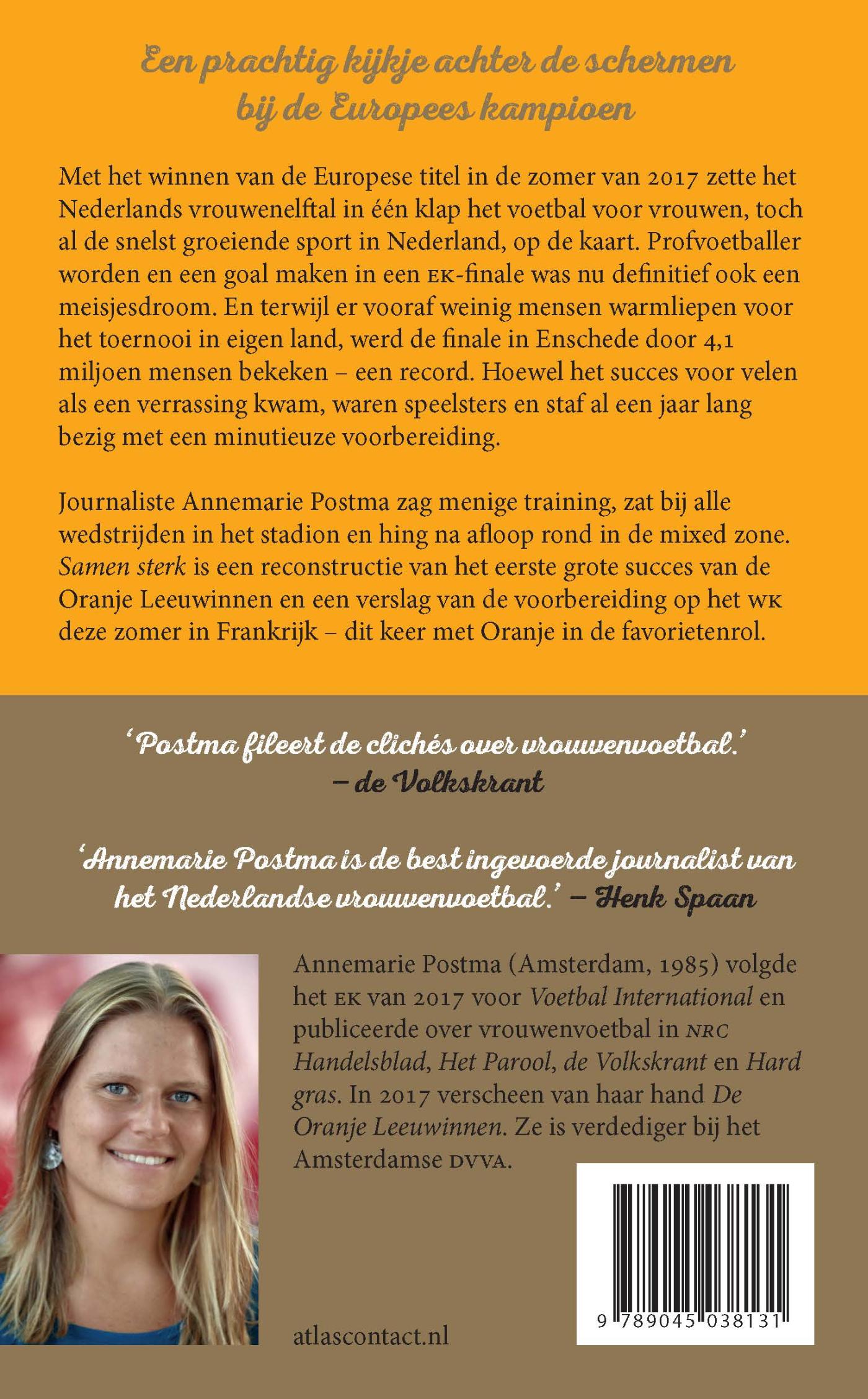 Met ‘Samen sterk’ schreef journaliste Annemarie Postma een reconstructie van het eerste grote succes van de Oranje Leeuwinnen: het winnen van het EK in de zomer van 2017. Daarnaast doet ze verslag van de voorbereiding op het WK deze zomer in Frankrijk – dit keer met Oranje in de favorietenrol. Na de winst van de Europese titel zette het Nederlands vrouwenelftal in één klap het voetbal voor vrouwen, toch al de snelst groeiende sport in Nederland, op de kaart. Profvoetballer worden en een goal maken in een EK-finale was nu definitief ook een meisjesdroom. En terwijl er vooraf weinig mensen warmliepen voor het toernooi in eigen land, werd de finale in Enschede door 4,1 miljoen mensen bekeken – een record. Hoewel het succes voor velen als een verrassing kwam, waren speelsters en staf al een jaar lang bezig met een minutieuze voorbereiding. Journaliste Annemarie Postma zag menige training, zat bij alle wedstrijden in het stadion en hing na afloop rond in de mixed zone.