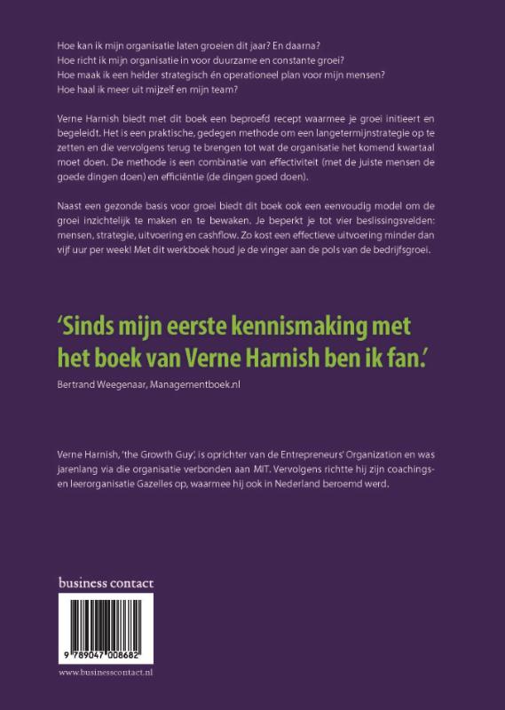 Hoe kan ik mijn organisatie laten groeien dit jaar? En daarna? Hoe richt ik mijn organisatie in voor duurzame en constante groei? Hoe maak ik een helder strategisch én operationeel plan voor mijn mensen? Hoe haal ik meer uit mijzelf en mijn team? ‘Scaling up’ is een praktische, gedegen methode om een langetermijnstrategie op te zetten en die vervolgens terug te brengen tot wat de organisatie het komend kwartaal moet doen. De methode is een combinatie van effectiviteit (met de juiste mensen de goede dingen doen) en efficiëntie (de dingen goed doen). Naast een gezonde basis voor groei biedt dit boek ook een eenvoudig model om de groei inzichtelijk te maken en te bewaken. Je beperkt je tot vier beslissingsvelden: mensen, strategie, uitvoering en cashflow. Zo kost een effectieve uitvoering minder dan vijf uur per week! Met dit werkboek houd je de vinger aan de pols van de bedrijfsgroei.