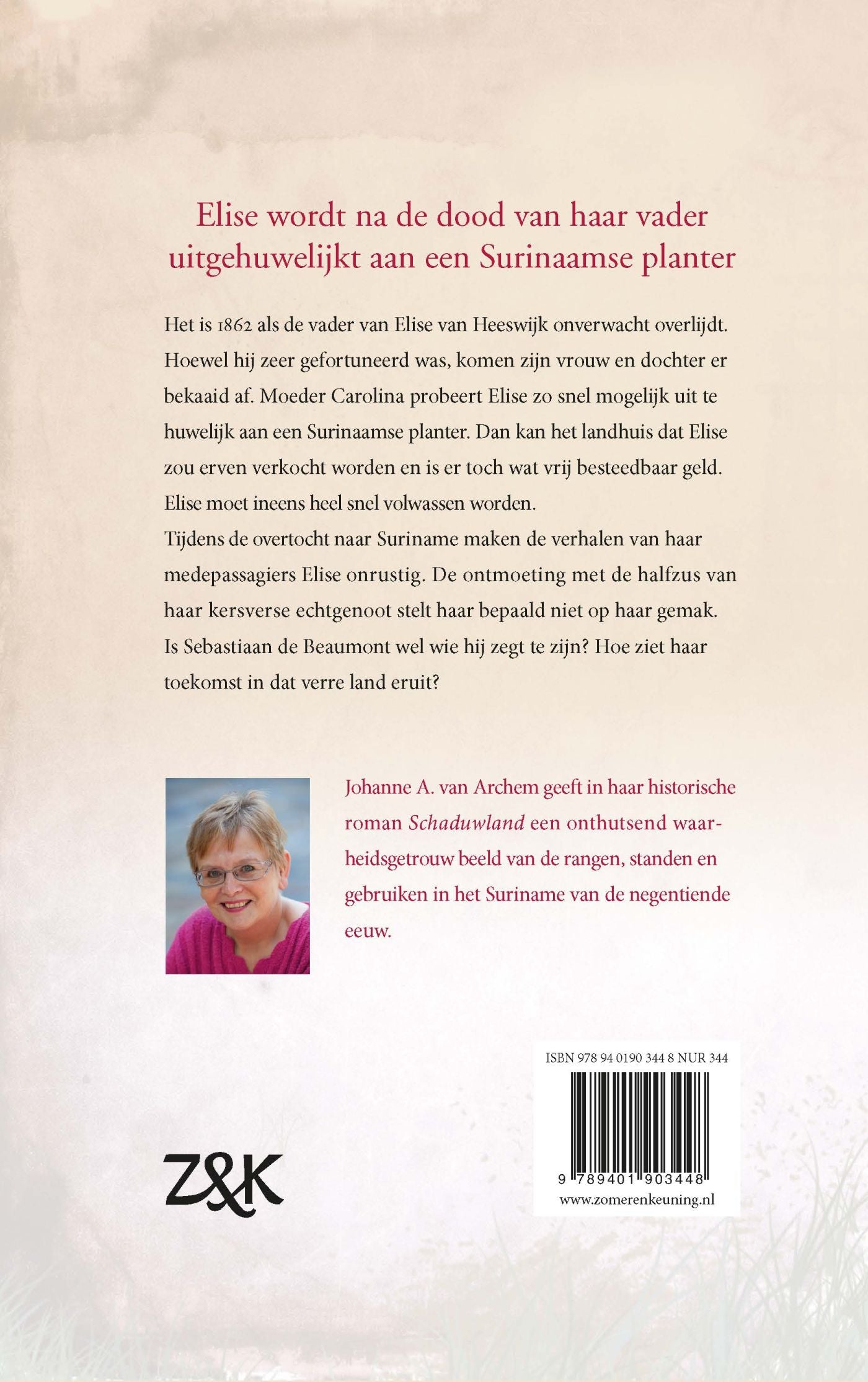 De historische romans van Johanne A. van Archem spelen zich doorgaans af in en om Twente, maar voor Schaduwland duikt zij in het slavernijverleden. Haar roman geeft een onthutsend waarheidsgetrouw beeld van de rangen, standen en gebruiken in het negentiende-eeuwse Suriname.