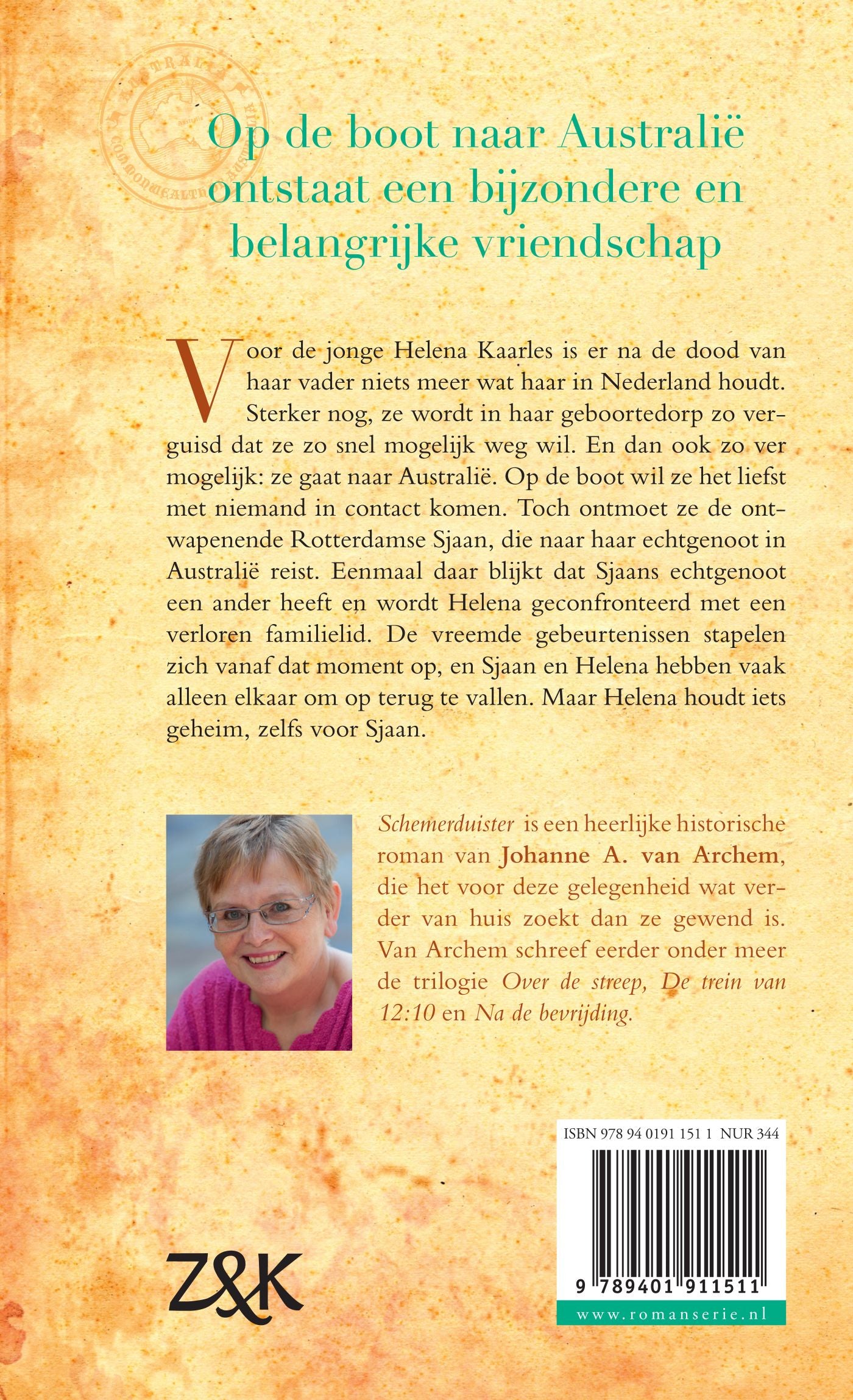 ‘Schemerduister’ van Johanne A. van Archem vertelt het verhaal van twee jonge vrouwen die in de naoorlogse jaren emigreren naar Australië. De bleue Helena doet dat omdat haar vader lid was van de NSB en omdat zij nu in haar dorp wordt verguisd. De stoere Rotterdamse Sjaan stapt op de boot omdat haar geliefde in Australië woont. Wanneer de vrouwen elkaar aan boord ontmoeten, ontstaat een bijzondere vriendschap. Eenmaal in Australië blijkt dat ze elkaar hard nodig zullen hebben. Johanne A. van Archems ‘Schemerduister’ is een prachtige roman over sterke karakters in harde tijden