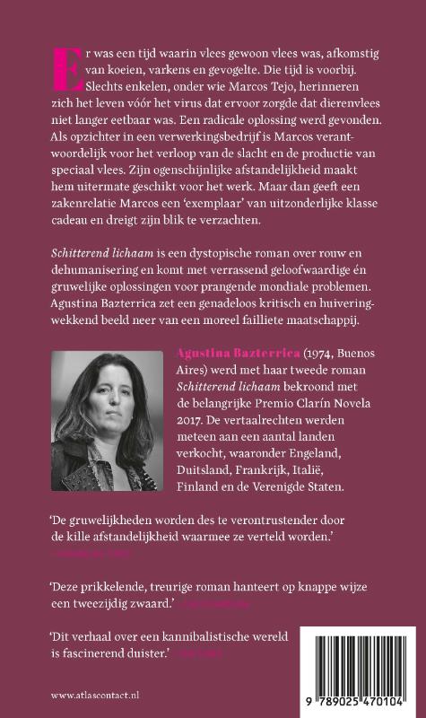 ‘Schitterend lichaam’ gaat over rouw en dehumanisering én komt met verrassend geloofwaardige én gruwelijke oplossingen voor prangende mondiale problemen. Bazterrica zet een genadeloos kritisch en huiveringwekkend beeld neer van een moreel failliete maatschappij.