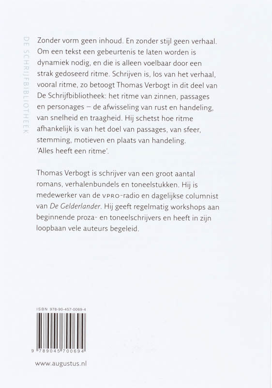 Zonder vorm geen inhoud. En zonder stijl geen verhaal. Om een tekst een gebeurtenis te talen worden is dynamiek nodig, en die is alleen voelbaar door een strak gedoseerd ritme. Schrijven is, los van het verhaal, vooral ritme: het ritme van zinnen, passages en personages - de afwisseling van rust en handeling, van snelheid en traagheid. In dit boek schetst Verbogt hoe ritme afhankelijk is van het doel van passages, van sfeer, stemming, motieven en plaats van handeling. 'Alles heeft een ritme.