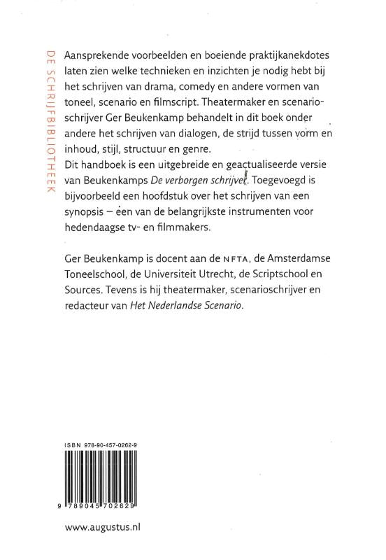Aansprekende voorbeelden en boeiende praktijkanekdotes laten zien welke technieken en inzichten je nodig hebt bij het schrijven van drama, comedy en andere vormen van toneel, scenario en filmscript. Theatermaker en scenarioschrijver Ger Beukenkamp behandelt in dit boek onder andere het schrijven van dialogen, de strijd tussen vorm en inhoud, stijl, structuur en genre. Dit handboek is een uitgebreide en geactualiseerde versie van Beukenkamps De verborgen schrijver. Toegevoegd is onder andere een hoofdstuk over het schrijven van een synopsis een van de belangrijkste instrumenten voor hedendaagse tv- en filmmakers