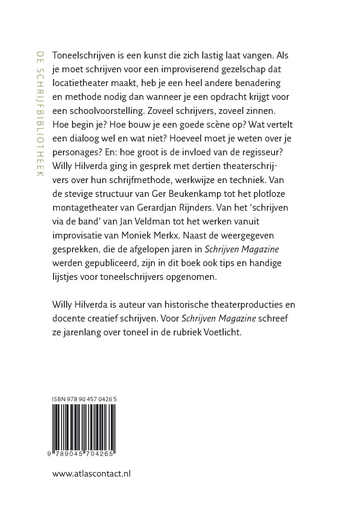 Journalist, schrijver en schrijfdocent Willy Hilverda ging in gesprek met dertien theaterschrijvers over hun schrijfmethode, werkwijze en techniek. Van de stevige structuur van Ger Beukenkamp tot het plotloze montagetheater van Gerardjan Rijnders. Van het schrijven via de band van Jan Veldman tot het werken vanuit improvisatie van Moniek Merkx.