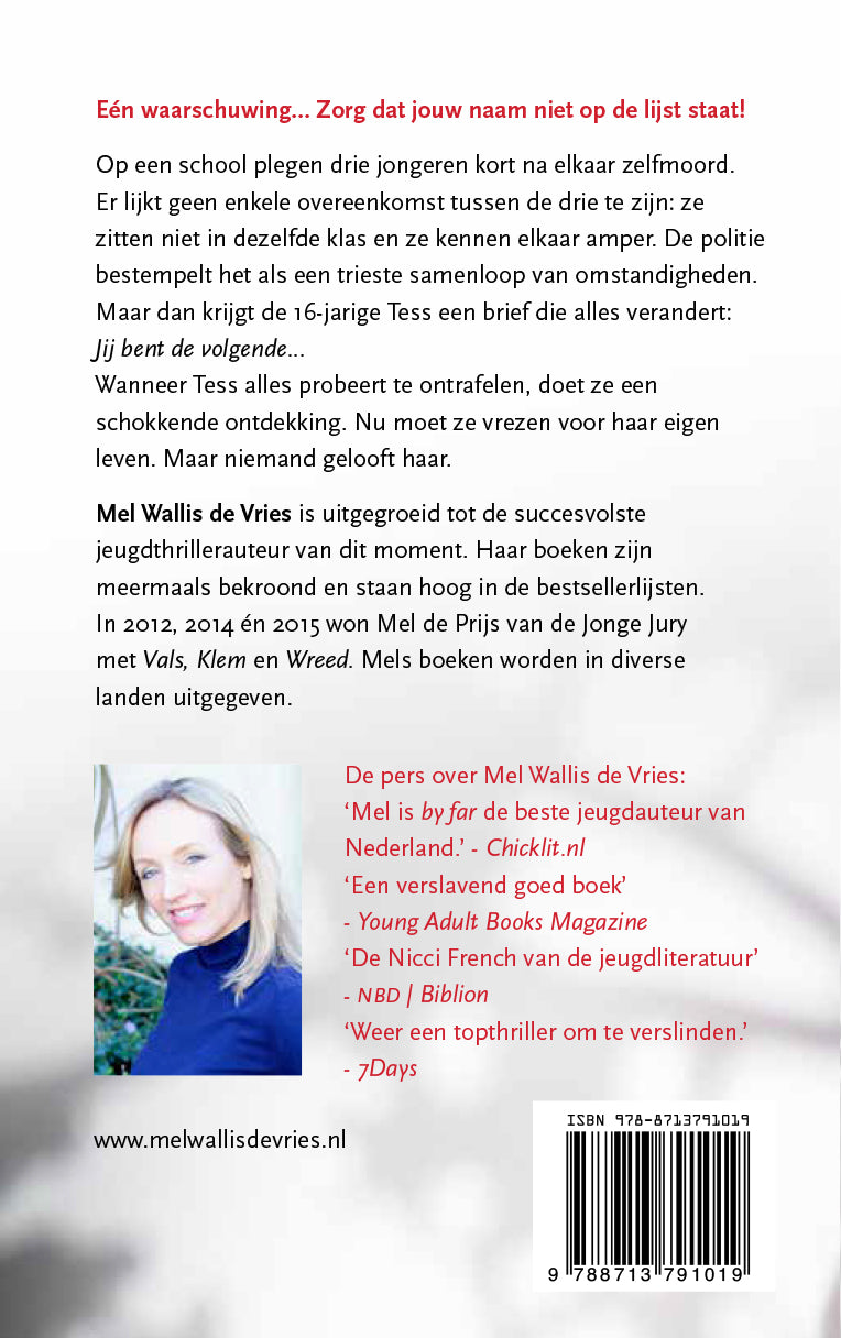 'Schuld' van Mel Wallis de Vries: deze jeugdthriller lees je in één adem uit. Mel Wallis de Vries won drie keer de Prijs van de Jonge Jury met haar thrillers 'Vals', 'Klem' en 'Wreed'. Kort na elkaar plegen enkele leerlingen zelfmoord. Er lijkt geen verband tussen de jongeren te zijn. De politie bestempelt het dan ook als een trieste samenloop van omstandigheden. Maar dan krijgt de 16-jarige Tess een brief die alles verandert: JIJ BENT DE VOLGENDE… Wanneer Tess alles probeert te ontrafelen, doet ze een schokkende ontdekking. Nu moet ze vrezen voor haar eigen leven. Maar niemand gelooft haar. Eén waarschuwing: zorg dat je naam niet op de lijst staat. ‘Mel is by far de beste jeugdauteur van Nederland.’ – Chicklit.nl ‘De Nicci French van de jeugdliteratuur’ – NBD Biblion