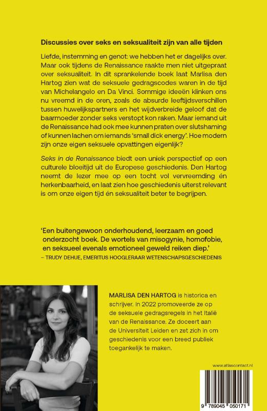 Liefde, instemming en genot: we hebben het er dagelijks over. Ook tijdens de Renaissance raakte men niet uitgepraat over seksualiteit. Sommige ideeën klinken ons nu vreemd in de oren, zoals de absurde leeftijdsverschillen tussen huwelijkspartners en het wijdverbreide geloof dat de baarmoeder zonder seks verstopt kon raken. Maar iemand uit de Renaissance had ook mee kunnen praten over slutshaming, of kunnen lachen om iemands ‘small dick energy’. In dit sprankelende boek laat Marlisa den Hartog zien wat de seksuele gedragscodes waren in de tijd van Michelangelo en Da Vinci. En hoe modern zijn onze eigen seksuele opvattingen eigenlijk?
