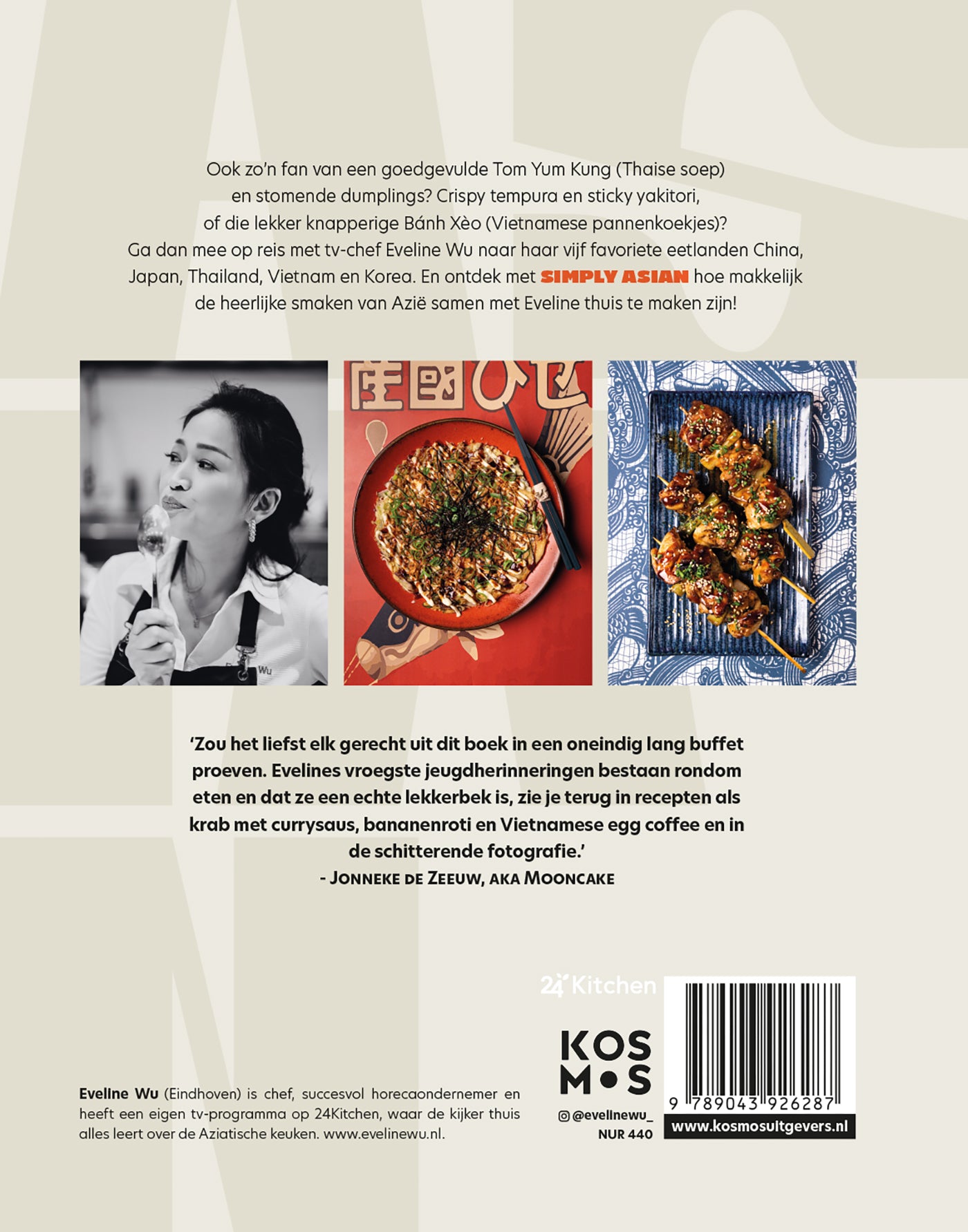 In Simply Asian laat Eveline Wu zien hoe simpel en eenvoudig je thuis de Aziatische favorieten kookt. Ga mee haar mee op reis naar haar vijf favoriete eetlanden: China, Japan, Thailand, Vietnam en Korea. Zet ook topgerechten als de lekkerste wontons, buns of noodle-soepjes zo op tafel!