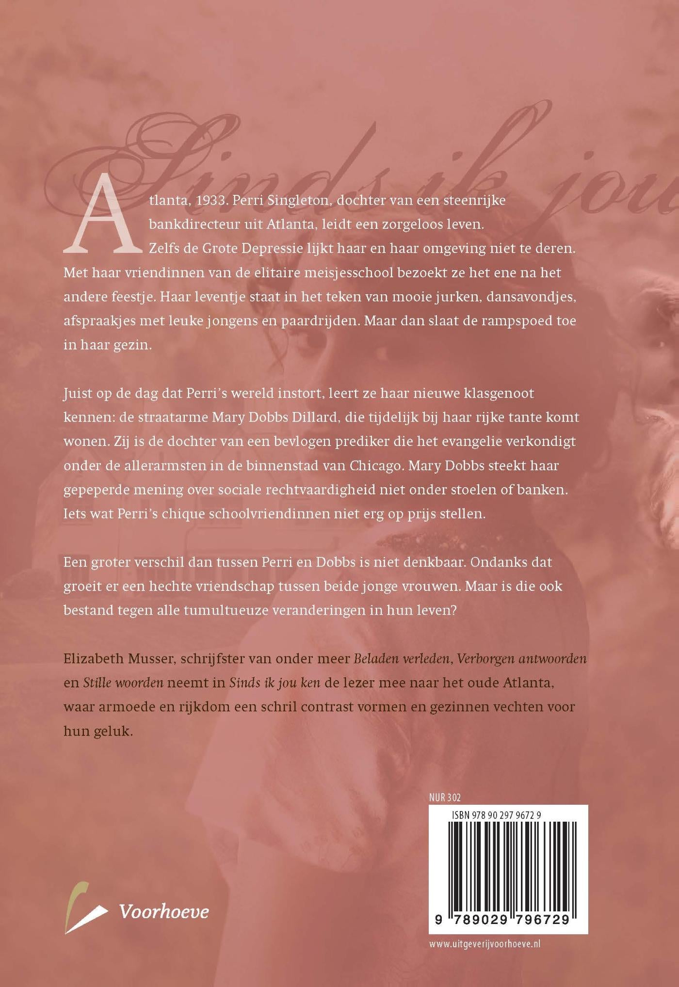 In Sinds ik jou ken neemt Elizabeth Musser de lezer mee naar het oude Atlanta, waar armoede en rijkdom een schril contrast vormen, gezinnen vechten voor hun geluk en twee meisjes de werkelijke waarde ontdekken van liefde, vriendschap en geloof. Musser baseerde de roman op het levensverhaal van haar grootmoeder.