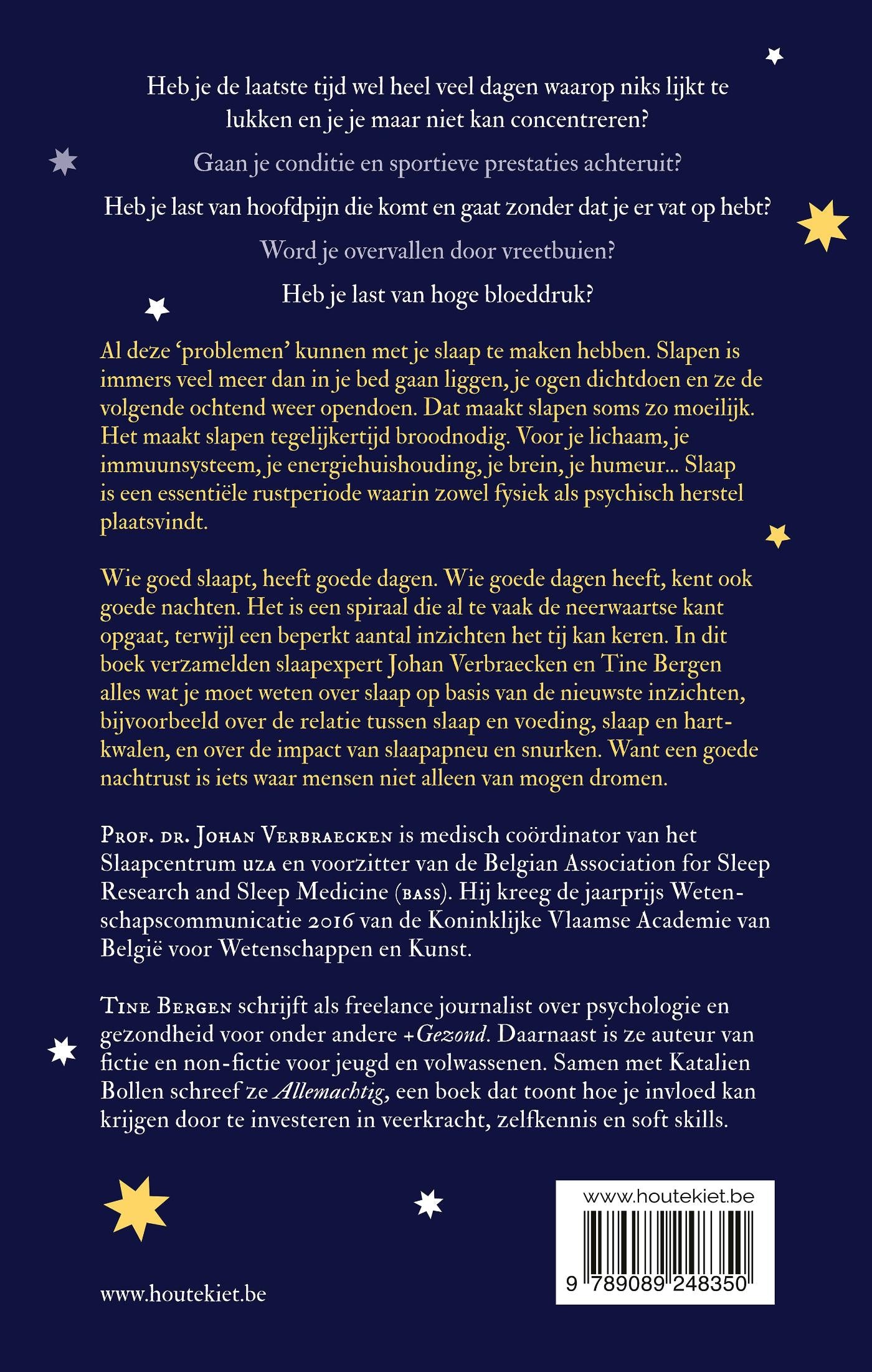 Wie goed slaapt, heeft goede dagen. Wie goede dagen heeft, kent ook goede nachten. Het is een spiraal die al te vaak de neerwaartse kant opgaat. Terwijl een beperkt aantal inzichten die spiraal kan omkeren. In dit boek verzamelden slaapexpert Johan Verbraecken en Tine Bergen alles wat je moet weten over slaap op basis van de nieuwste inzichten, bijvoorbeeld over de relatie tussen slaap en voeding, slaap en hartkwalen, en over de impact van slaapapneu en snurken. Want een goede nachtrust is iets waar mensen niet alleen van mogen dromen.
