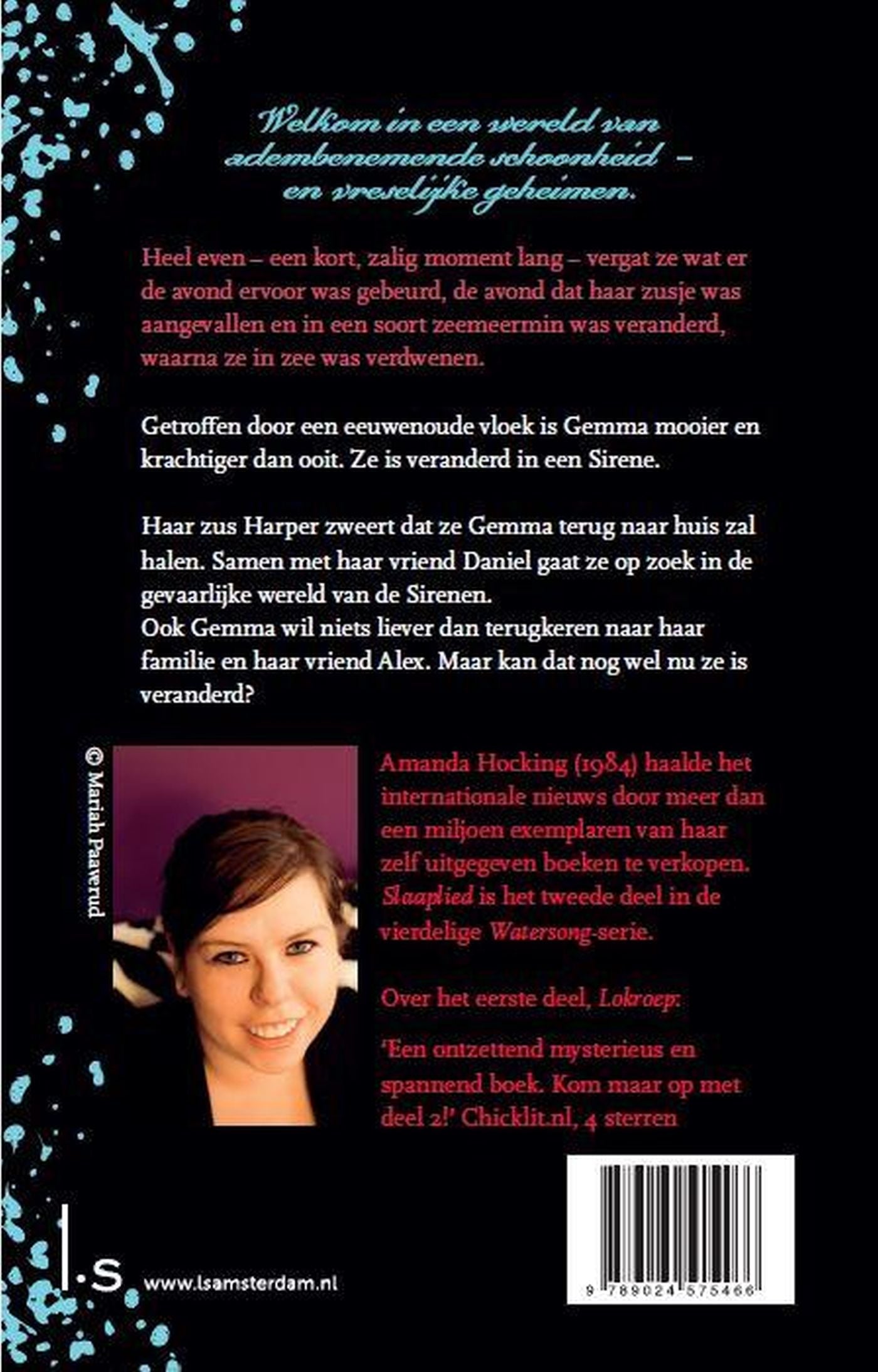 Amanda Hocking (1984) haalde het internationale nieuws door meer dan een miljoen exemplaren van haar zelf uitgegeven boeken te verkopen. Slaaplied is het tweede deel in de vierdelige Watersong-serie.