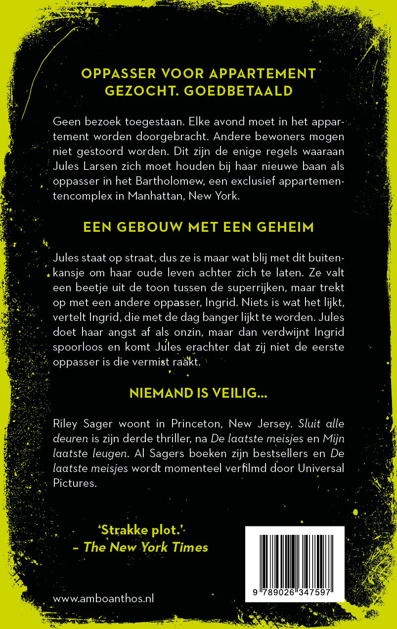 Sluit alle deuren is de nieuwste thriller van Riley Sager, bekend van De laatste meisjes en Mijn laatste leugen. Spannend van begin tot eind; Stephen King, Karin Slaughter en Lisa Gardner zijn al fan.