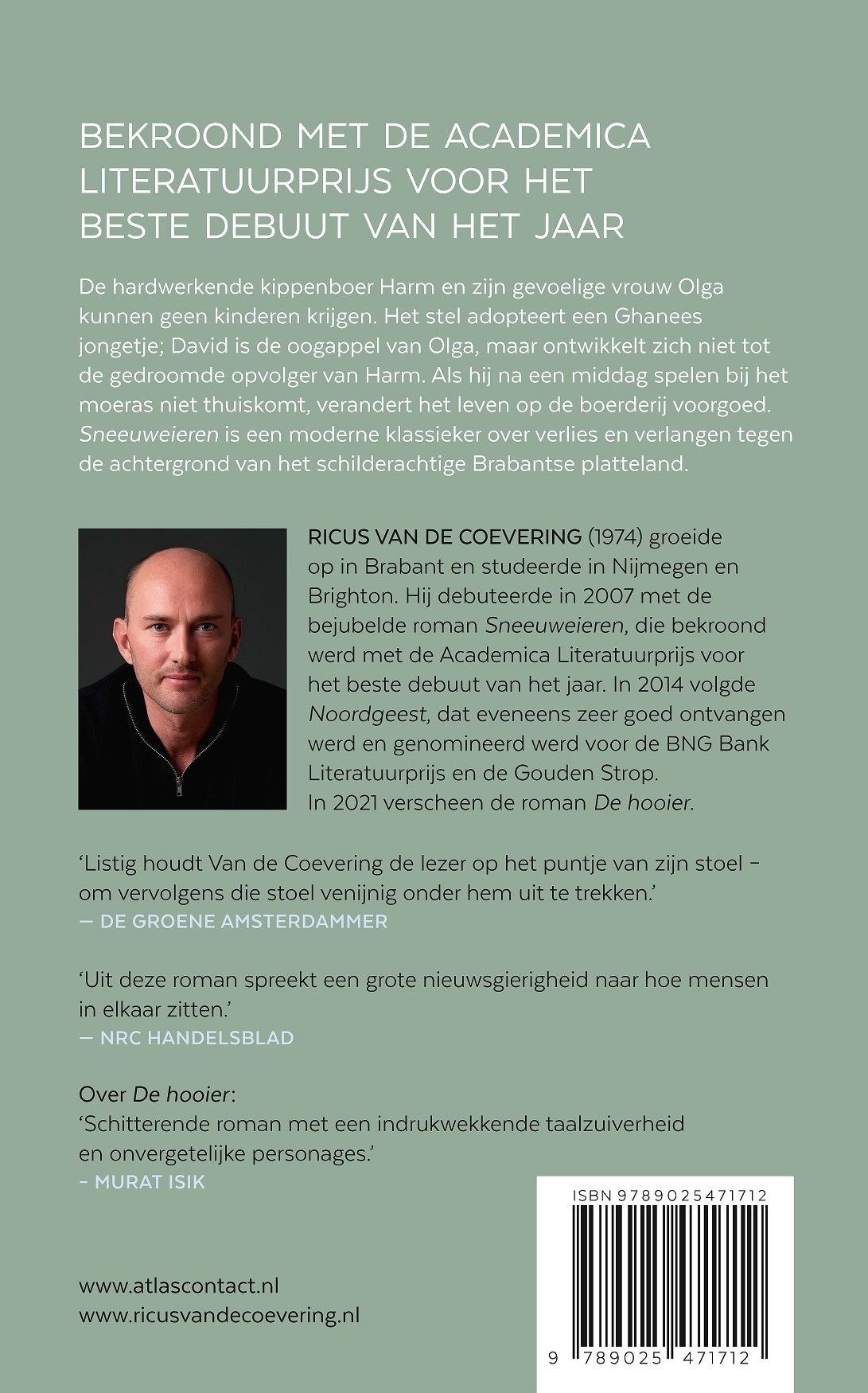 ‘Sneeuweieren’ van Ricus van de Coevering speelt zich af rondom de hardwerkende kippenboer Harm en zijn gevoelige vrouw Olga, die geen kinderen kunnen krijgen. Het stel adopteert een Ghanees jongetje; David is de oogappel van Olga, maar ontwikkelt zich niet tot de gedroomde opvolger van Harm. Als hij na een middag spelen bij het moeras niet thuiskomt, verandert het leven op de boerderij voorgoed. ‘Sneeuweieren’ is een moderne klassieker over verlies en verlangen tegen de achtergrond van het schilderachtige Brabantse platteland.