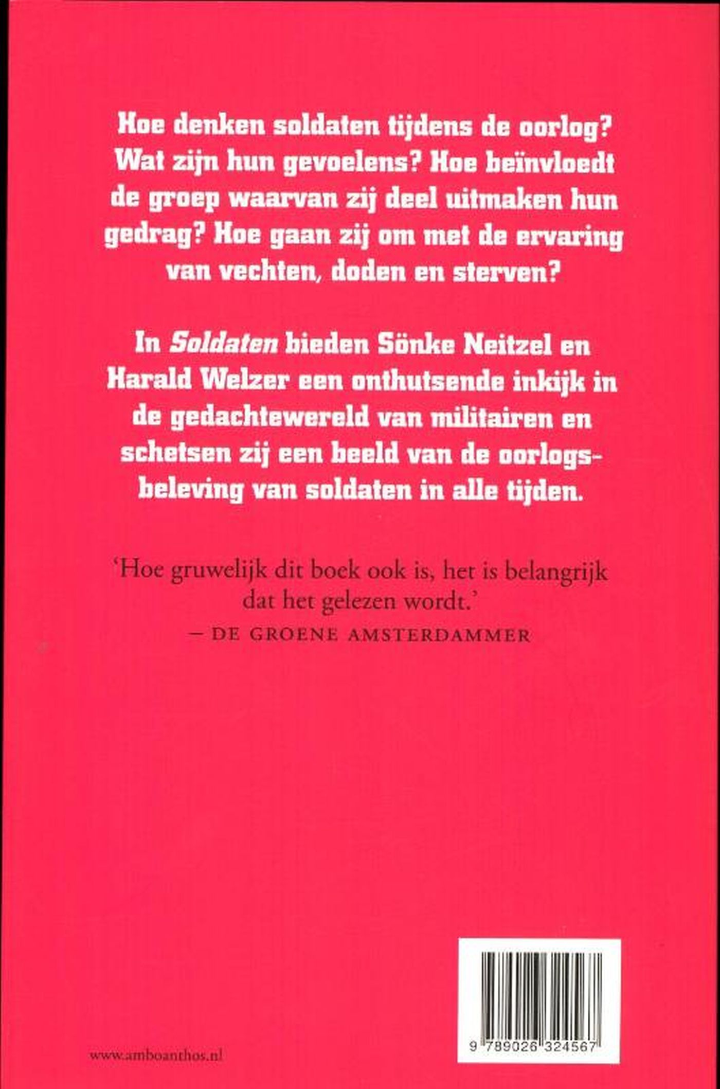 Op basis van de afluisterverslagen tonen historicus Sönke Neitzel en sociaalpsycholoog Harald Welzer hoe soldaten in oorlog denken en voelen. Neitzel en Welzer laten zien dat de moraal en mentaliteit van soldaten in elke oorlog dezelfde is. Of dat nu in Afghanistan, Irak of ergens anders is.
