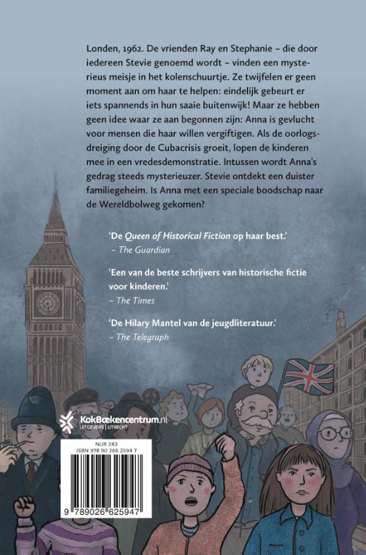 ‘Spanning in de lucht’ van Emma Carroll is een historische jeugdroman die zich afspeelt in Londen, ten tijde van de Koude oorlog, voor kinderen vanaf tien jaar. De vrienden Stevie en Ray vinden een mysterieus meisje in het kolenschuurtje, en besluiten twijfelen geen moment om haar te helpen. Eindelijk gebeurt er iets spannends in hun saaie buitenwijk. Maar ze hebben geen idee waar ze aan begonnen zijn, Anna is gevlucht voor mensen die haar willen vergiftigen. De Cubacrisis is voortdurend in het nieuws, en de kinderen besluiten om mee te demonstreren. Als de oorlogsdreiging groeit, wordt Anna’s gedrag steeds mysterieuzer. Stevie ontdekt een duister familiegeheim. Is Anna met een speciale boodschap naar de Wereldbolweg gekomen?