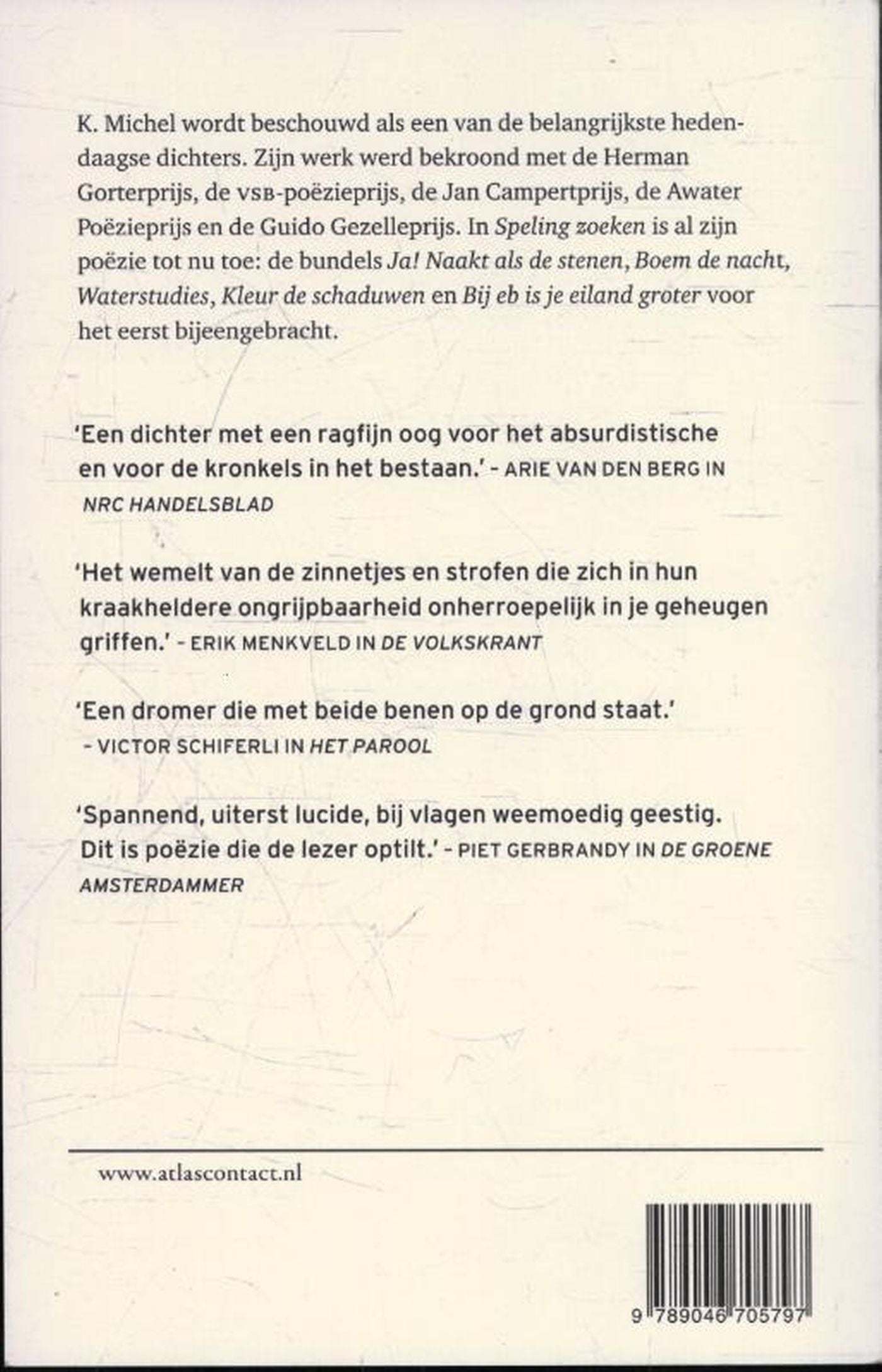 K. Michel wordt beschouwd als een van de belangrijkste hedendaagse dichters. Hij publiceert niet veel – vanaf zijn debuut in 1989 slechts vijf dichtbundels – maar zijn werk wordt steevast zeer goed ontvangen in binnen- en buitenland. In Speling zoeken zijn die vijf bundels, Ja! Naakt als de stenen, Boem de nacht, Waterstudies, Kleur de schaduwen en Bij eb is je eiland groter, voor het eerst bijeengebracht.