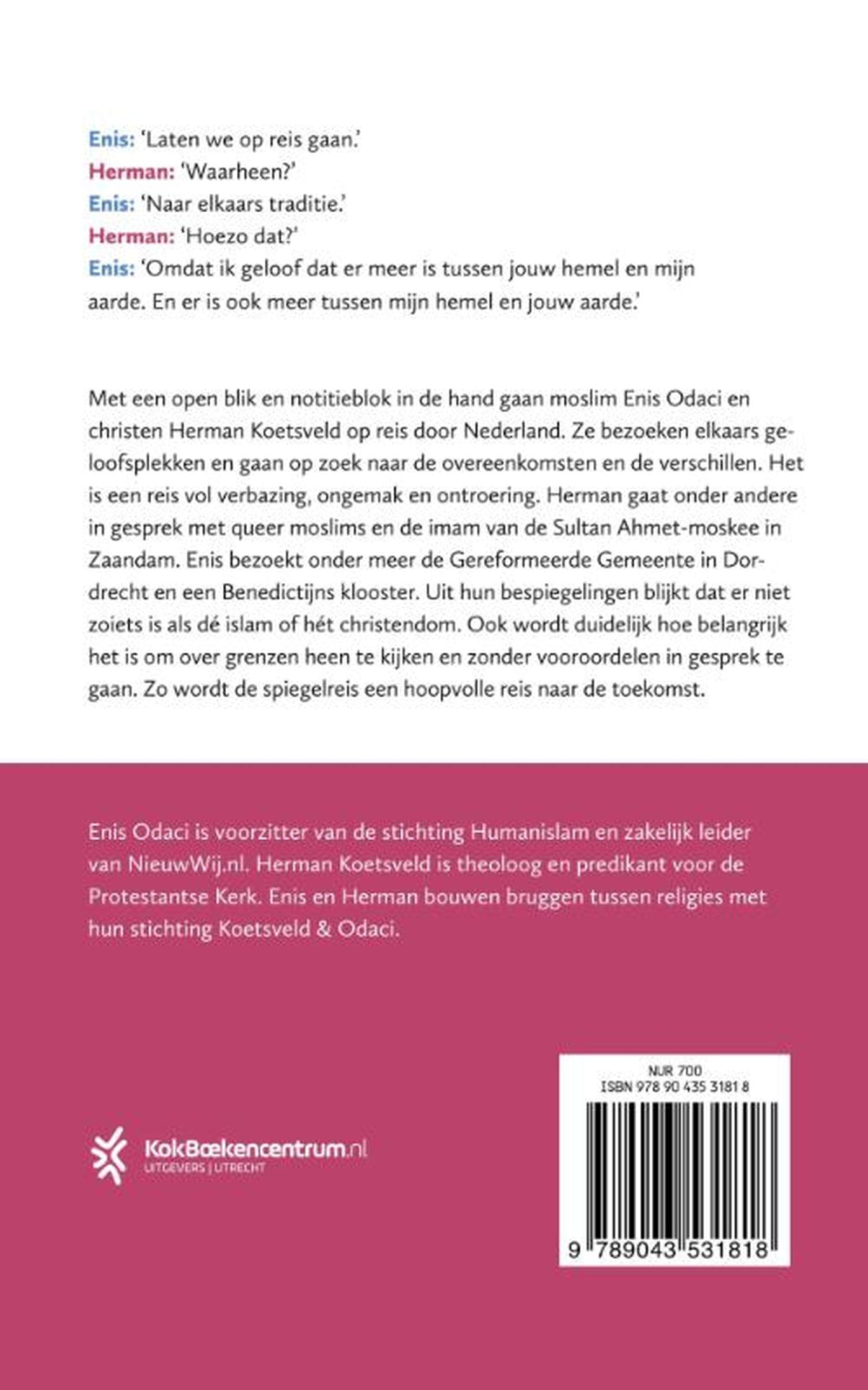 In 'Spiegelreis' gaan moslim Enis Odaci en christen Herman Koetsveld met een open blik en notitieblok in de hand op reis door Nederland. Ze bezoeken elkaars geloofsplekken en gaan op zoek naar de overeenkomsten en de verschillen. Het is een reis vol verbazing, ongemak en ontroering. Herman gaat onder andere in gesprek met queer moslims en de imam van de Sultan Ahmet-moskee in Zaandam. Enis bezoekt onder meer de Gereformeerde Gemeente in Dordrecht en een Benedictijns klooster. Uit hun bespiegelingen blijkt dat er niet zoiets is als dé islam of hét christendom. Ook wordt duidelijk hoe belangrijk het is om over grenzen heen te kijken en zonder vooroordelen in gesprek te gaan. Zo wordt de spiegelreis een hoopvolle reis naar de toekomst.