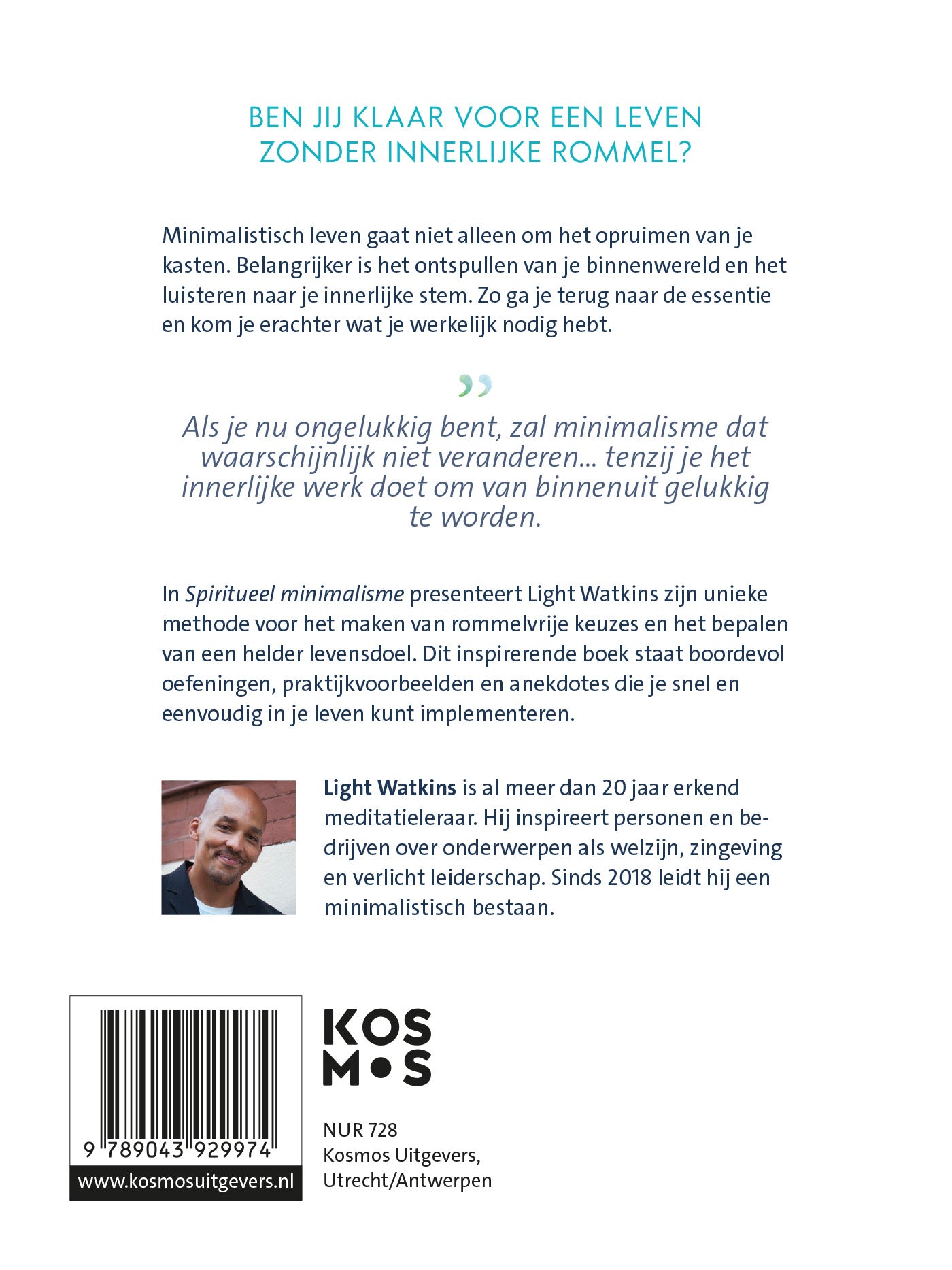 Minimalistisch leven gaat niet alleen om het opruimen van je kasten. Belangrijker is het ‘ontspullen’ van binnen en het luisteren naar je innerlijke stem. Zo kom je erachter wat je werkelijk nodig hebt. In ‘Spiritueel minimalisme’ deelt Light Watkins zijn unieke methode voor het maken van rommelvrije keuzes en het bepalen van een helder levensdoel. Zoals hij het zelf zegt: ‘Als je nu ongelukkig bent, zal minimalisme dat waarschijnlijk niet veranderen... tenzij je het innerlijke werk doet om van binnenuit gelukkig te worden.’ Dit inspirerende boek staat boordevol oefeningen, praktijkvoorbeelden en anekdotes die je snel en eenvoudig in je leven kunt implementeren.