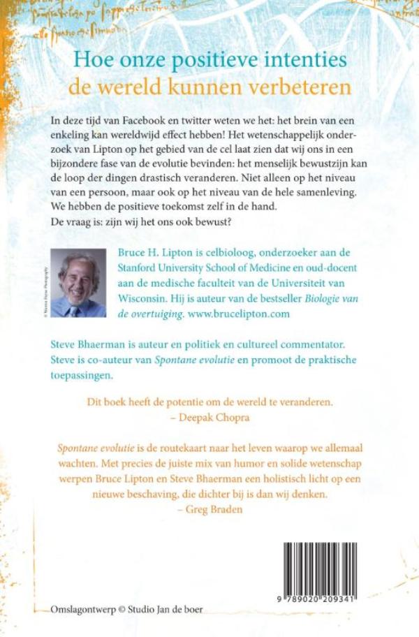 In deze tijd van sociale media en dankzij Spontane evolutie van Bruce Lipton weten we het: het brein van een enkeling kan wereldwijd effect hebben! Zijn wetenschappelijke onderzoek op het gebied van de cel laat zien dat wij ons in een bijzondere fase van de evolutie bevinden: het menselijk bewustzijn kan de loop der dingen drastisch veranderen. Niet alleen op het niveau van een persoon, maar ook op het niveau van de hele samenleving. We hebben de positieve toekomst zelf in de hand. De vraag is: zijn wij het ons ook bewust?
