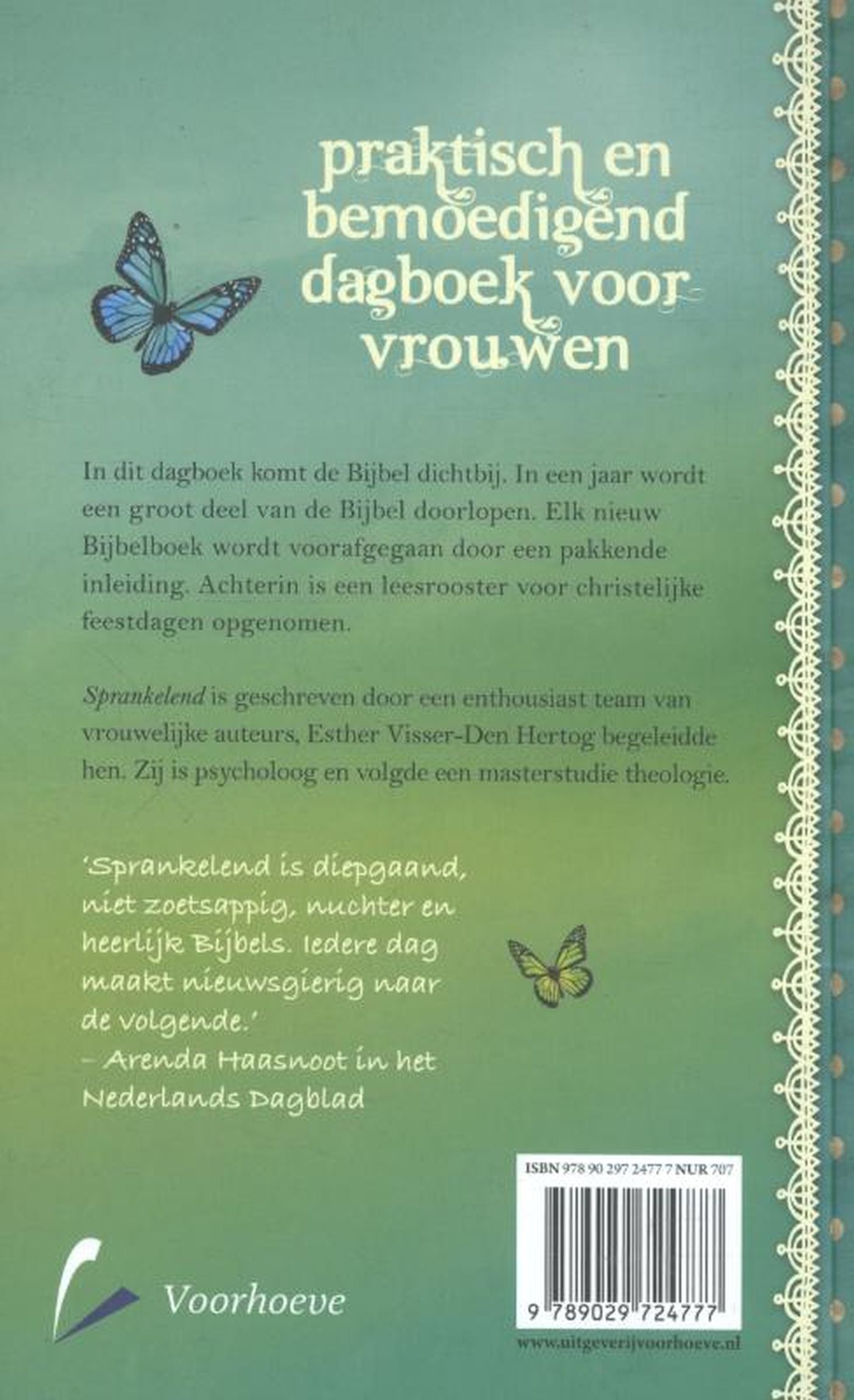 Fris, pakkend en praktisch. Een dagboek voor vrouwen, dat elke dag iets moois, iets bemoedi-gends wil aanreiken uit Gods Woord.Een dagboek met extra's. In een jaar wordt een groot deel van de Bijbel doorlopen. Elke nieuw Bijbelboek wordt voorafgegaan door een pakkende inleiding. Achterin een leesrooster voor christelijke feestdagen. Dit dagboek werd geschreven door een enthousiast team van vrouwelijke auteurs.