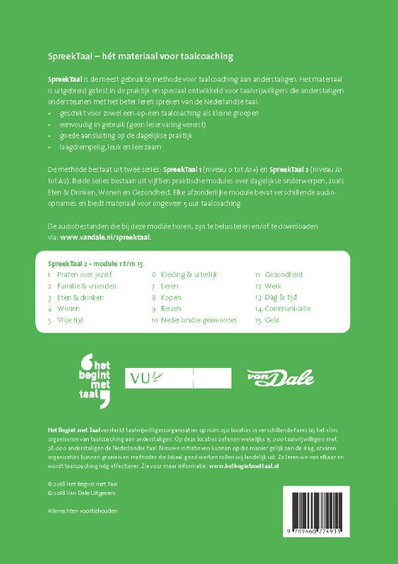 SpreekTaal is de meest gebruikte methode voor taalcoaching aan anderstaligen. Het materiaal is uitgebreid getest in de praktijk en speciaal ontwikkeld voor taalvrijwilligers die anderstaligen ondersteunen met het beter leren spreken van de Nederlandse taal.