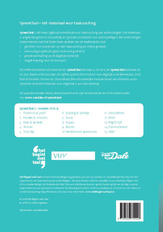 SpreekTaal is de meest gebruikte methode voor taalcoaching aan anderstaligen. Het materiaal is uitgebreid getest in de praktijk en speciaal ontwikkeld voor taalvrijwilligers die anderstaligen ondersteunen met het beter leren spreken van de Nederlandse taal.