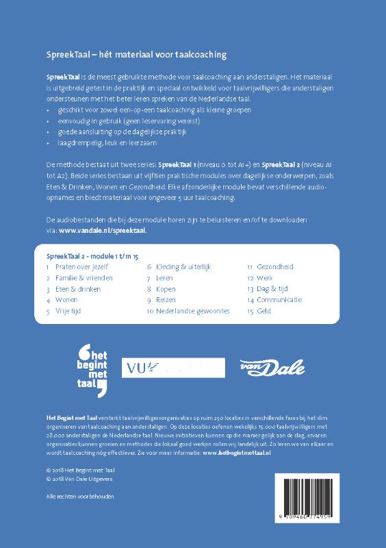 SpreekTaal is de meest gebruikte methode voor taalcoaching aan anderstaligen. Het materiaal is uitgebreid getest in de praktijk en speciaal ontwikkeld voor taalvrijwilligers die anderstaligen ondersteunen met het beter leren spreken van de Nederlandse taal.