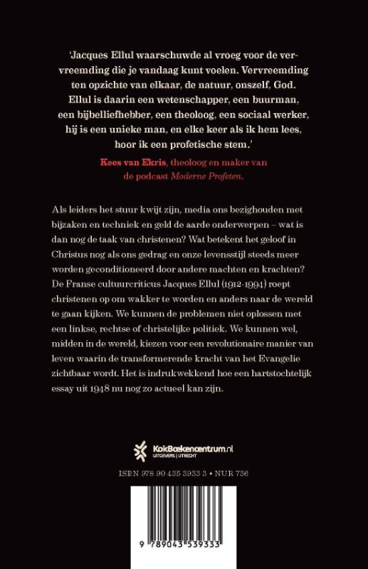 ‘Staan in de wereld van nu’ van Jacques Ellul is een hertaling van het boek dat oorspronkelijk werd uitgegeven in 1948. Maar hoewel het uit 1948 komt, is het indrukwekkend hoe dit hartstochtelijke essay nu nog zo actueel kan zijn. Als leiders het stuur kwijt zijn, media ons bezighouden met bijzaken, en techniek en geld de aarde onderwerpen – wat is dan nog de taak van christenen? Wat betekent het revolutionaire geloof in Christus als donkere wolken zich samenpakken boven de kerk en ons land, maar ook boven de hele aarde? Jacques Ellul was filosoof, socioloog, theoloog en hoogleraar in het recht. Hij stond bekend als de man die alles heeft voorzien en zijn essay leert christenen hoe ze moeten staan in deze wereld.