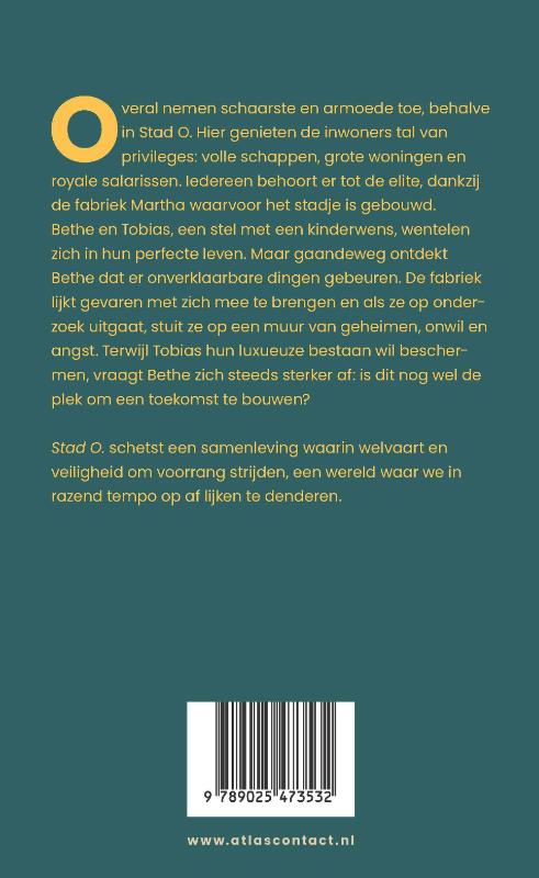 Overal nemen schaarste en armoede toe, behalve in Stad O. Hier genieten de inwoners tal van privileges: volle schappen, grote woningen en royale salarissen. Iedereen behoort er tot de elite, dankzij de fabriek Martha waarvoor het stadje is gebouwd. Bethe en Tobias, een stel met een kinderwens, wentelen zich in hun perfecte leven. Maar gaandeweg ontdekt Bethe dat er onverklaarbare dingen gebeuren. De fabriek lijkt gevaren met zich mee te brengen en als ze op onderzoek uitgaat, stuit ze op een muur van geheimen, onwil en angst. Terwijl Tobias hun luxueuze bestaan wil beschermen, vraagt Bethe zich steeds sterker af: is dit nog wel de plek om een toekomst te bouwen? Stad O. schetst een samenleving waarin welvaart en veiligheid om voorrang strijden, een wereld waar we in razend tempo op af lijken te denderen.