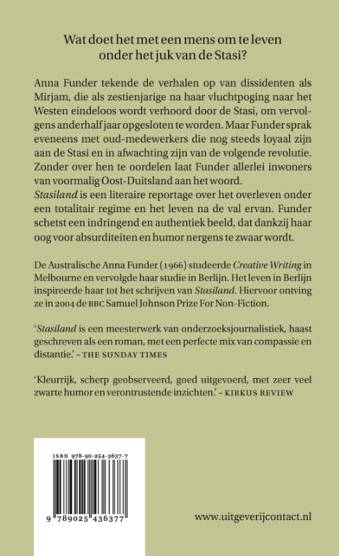 Een fascinerend verhaal over het leven in voormalig Oost-Duitsland. Funder tekende de verhalen op van dissidenten als Mirjam, die als zestienjarige na haar vluchtpoging naar het Westen eindeloos wordt verhoord door de Stasi, om vervolgens anderhalf jaar opgesloten te worden. Maar ze sprak eveneens met oud-medewerkers die nog steeds loyaal zijn aan de Stasi en in afwachting zijn van de volgende revolutie. Het levert een indringend en authentiek beeld op, dat dankzij haar oog voor absurditeiten en humor nergens te zwaar wordt.