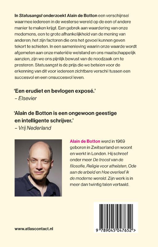 In Statusangst onderzoekt Alain de Botton een verschijnsel waarmee iedereen in de westerse wereld op de een of andere manier te maken krijgt. Een gebrek aan waardering van onze medemens, een te grote afhankelijkheid van de mening van anderen; het zijn allemaal factoren die ons het gevoel kunnen geven tekort te schieten. In een samenleving waarin onze waarde wordt afgemeten aan onze materiële wapenfeiten en ons maatschappelijk aanzien, zijn we ons pijnlijk bewust van de noodzaak om te presteren. Statusangst is de prijs die we betalen voor de erkenning van dit voor iedereen zichtbare verschil tussen een succesvol en een onsuccesvol leven.