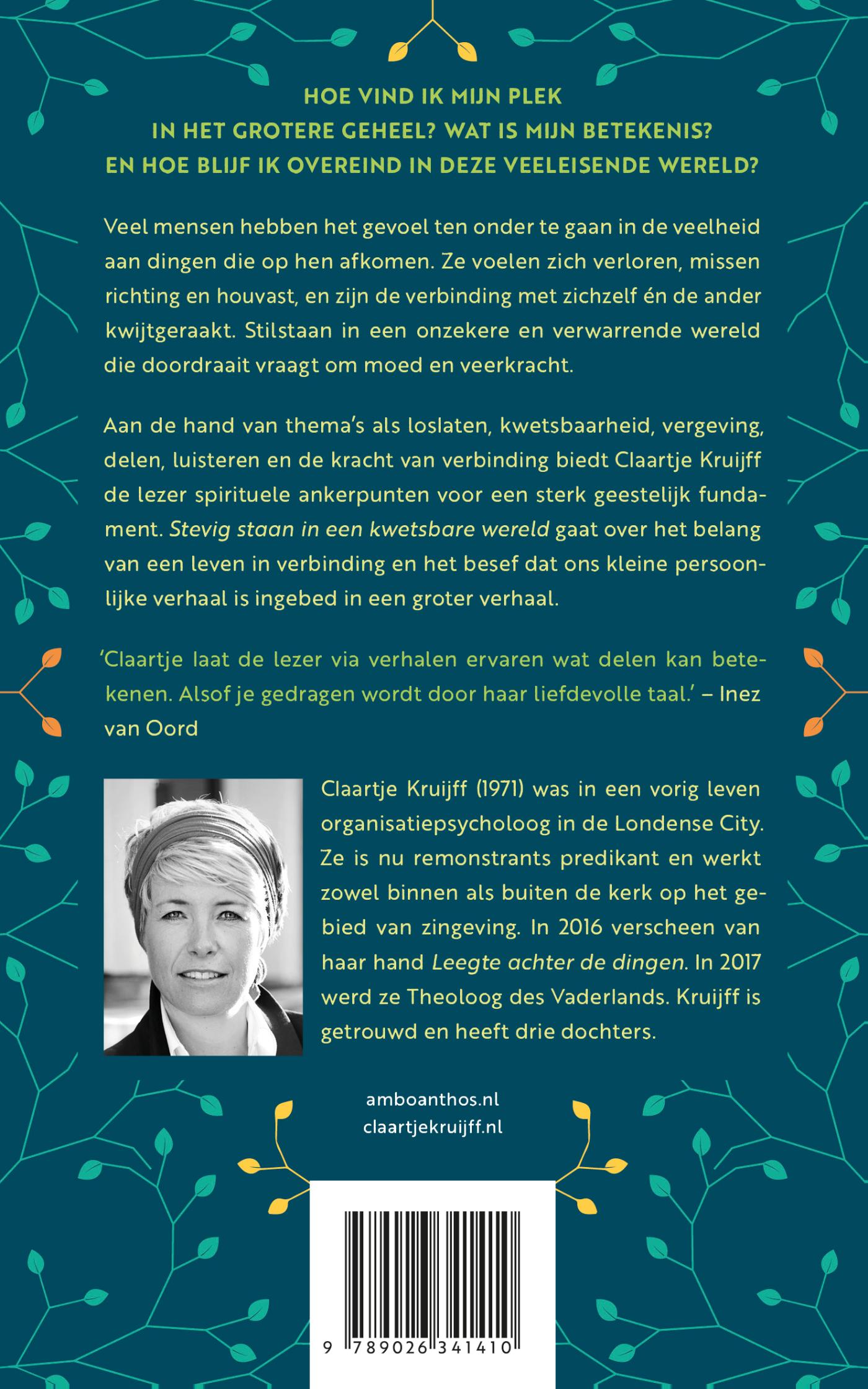 Aan de hand van thema’s als loslaten, kwetsbaarheid, vergeving, delen, luisteren en de kracht van verbinding biedt Claartje Kruijff de lezer spirituele ankerpunten voor een sterk geestelijk fundament. Stevig staan in een kwetsbare wereld gaat over het belang van een leven in verbinding en het besef dat ons kleine persoonlijke verhaal is ingebed in een groter verhaal. Vanuit die gedachte kunnen wij groter leven, betekenis ervaren en stevig staan.