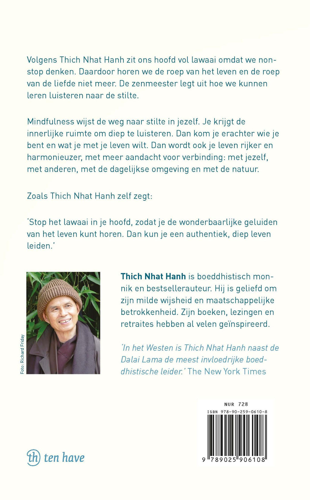 Thich Nhat Hanh legt uit hoe belangrijk het is om te luisteren naar de stilte. Daardoor wordt ons leven rijker en harmonieuzer, en krijgen we meer aandacht voor verbinding: met onszelf, met anderen, met de dagelijkse wereld om ons heen en met de natuur. De boeddhistische meester laat zien hoe mindfulness de weg wijst naar stilte in jezelf, en vandaar naar de geluiden die het leven echt waarde geven. Een toegankelijk en praktisch toepasbaar boek.