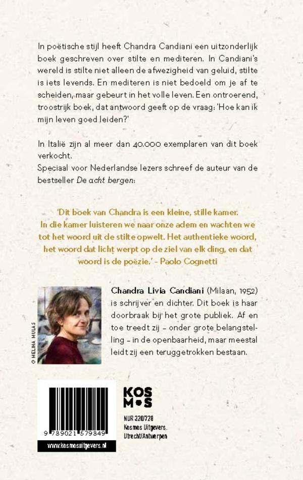 Met 'Stilte is iets levends' heeft Candiani een uitzonderlijk boek geschreven over stilte en mediteren, Paolo Cognetti is groot fan. In Candiani’s wereld is stilte niet niets, maar juist iets levends. Mediteren gebeurt in het volle leven en is niet bedoeld om je af te scheiden. Een ontroerend en troostrijk boek, dat antwoord geeft op de vraag: ‘Hoe kan ik mijn leven goed leiden?’
