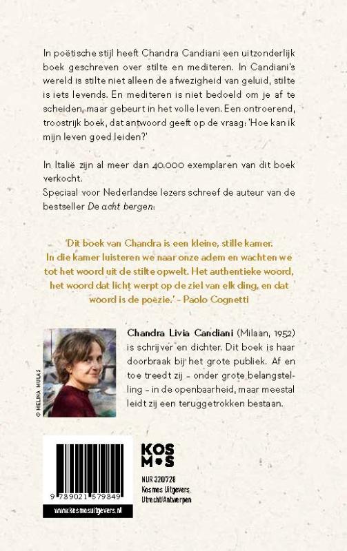 In Candiani’s wereld is stilte niet niets, maar juist iets levends. Mediteren gebeurt in het volle leven en is niet bedoeld om je af te scheiden. Een ontroerend en troostrijk boek, dat antwoord geeft op de vraag: ‘Hoe kan ik mijn leven goed leiden?’