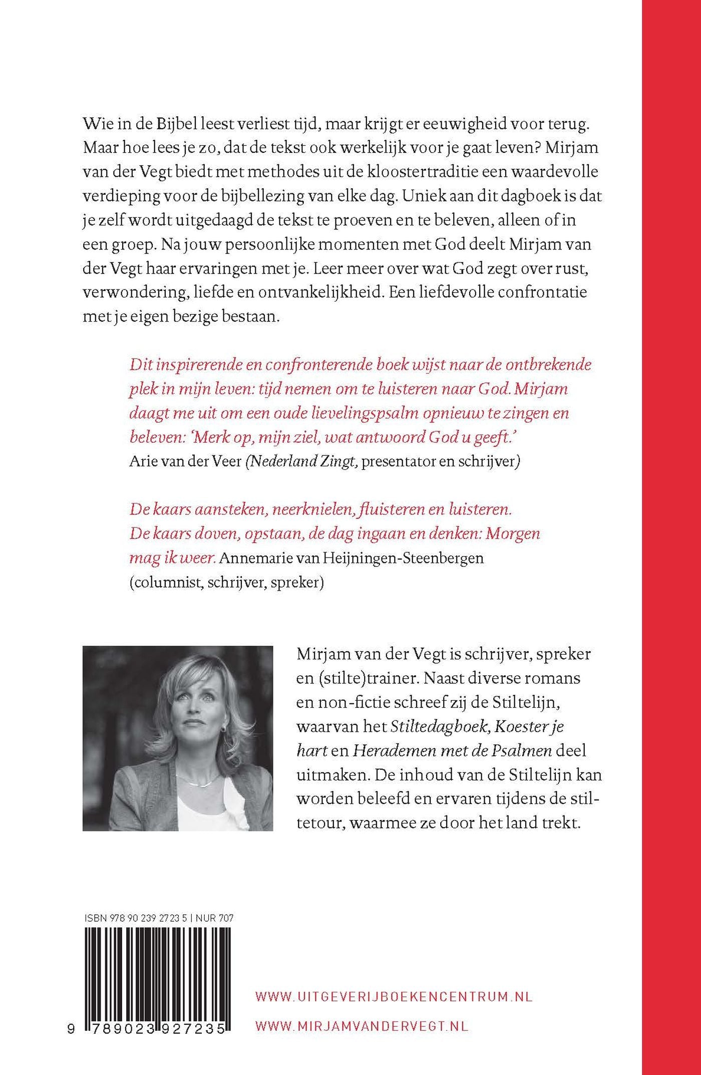Wie in de Bijbel leest verliest tijd, maar krijgt er eeuwigheid voor terug. Maar hoe lees je zo, dat de tekst ook werkelijk voor je gaat leven? Mirjam van der Vegt biedt met methodes uit de kloostertraditie een waardevolle verdieping voor de bijbellezing van elke dag. Uniek aan dit dagboek is dat je zelf wordt uitgedaagd de tekst te proeven en te beleven, alleen of in een groep. Na jouw persoonlijke momenten met God deelt Mirjam van der Vegt haar ervaringen met je. Leer meer over wat God zegt over rust, verwondering, liefde en ontvankelijkheid.