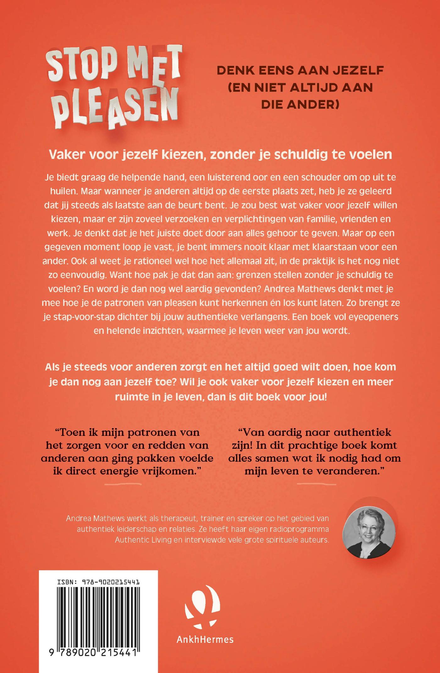 'Stop met pleasen' van Andrea Mathews is het antwoord in boekvorm op een probleem waar ontzettend veel mensen mee worstelen: zij zetten altijd anderen op de eerste plek in plaats van zichzelf. Je biedt graag een helpende hand, een luisterend oor en een schouder om uit te huilen. Maar wanneer je anderen steeds op de eerste plek zet, heb je ze geleerd dat jij zelf steeds als laatste aan de beurt bent.