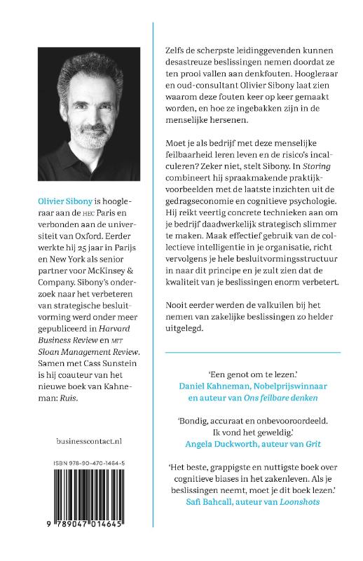 In ‘Storing’ laat hoogleraar en oud-consultant Olivier Sibony zien dat zelfs de scherpste leidinggevenden desastreuze beslissingen kunnen nemen doordat ze ten prooi vallen aan denkfouten, waarom deze fouten keer op keer gemaakt worden, en hoe ze ingebakken zijn in de menselijke hersenen.