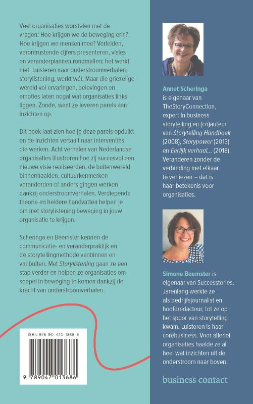 In ‘Storylistening’ geven Annet Scheringa en Simone Beemster antwoord op vragen waar veel organisaties mee worstelen. Vragen als: hoe krijgen we de beweging erin? Hoe krijgen we mensen mee? Verleiden, verontrustende cijfers presenteren, visies en veranderplannen rondmailen: het werkt niet. Luisteren naar onderstroomverhalen, storylistening, werkt wél. Maar die griezelige wereld vol ervaringen, belevingen en emoties laten nogal wat organisaties links liggen. Zonde, want ze leveren parels aan inzichten op.