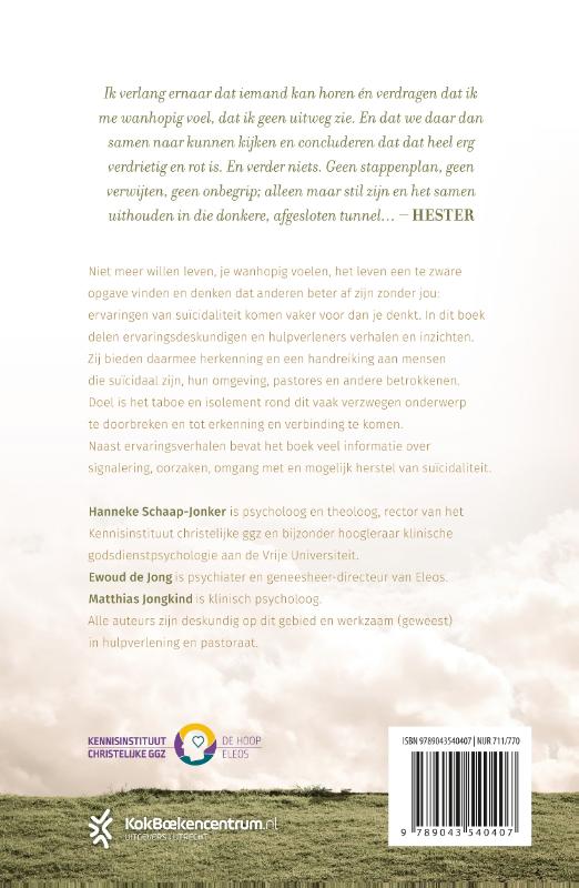 Suïcide van Hanneke Schaap-Jonker, Ewoud de Jong en Matthias Jongkind is een pastoraal boek over het vaak verzwegen onderwerp zelfdoding. Niet meer willen leven, je wanhopig voelen, het leven een te zware opgave vinden, denken dat anderen beter af zijn zonder jou: ervaringen van suïcidaliteit komen vaker voor dan je denkt. In dit boek delen ervaringsdeskundigen en hulpverleners verhalen en inzichten. Mensen die suïcidaal zijn, hun omgeving, pastores en andere betrokkenen kunnen hierin herkenning en handreikingen vinden. Doel is het taboe en isolement rond dit beladen onderwerp te doorbreken, wat tot erkenning en verbinding kan leiden.