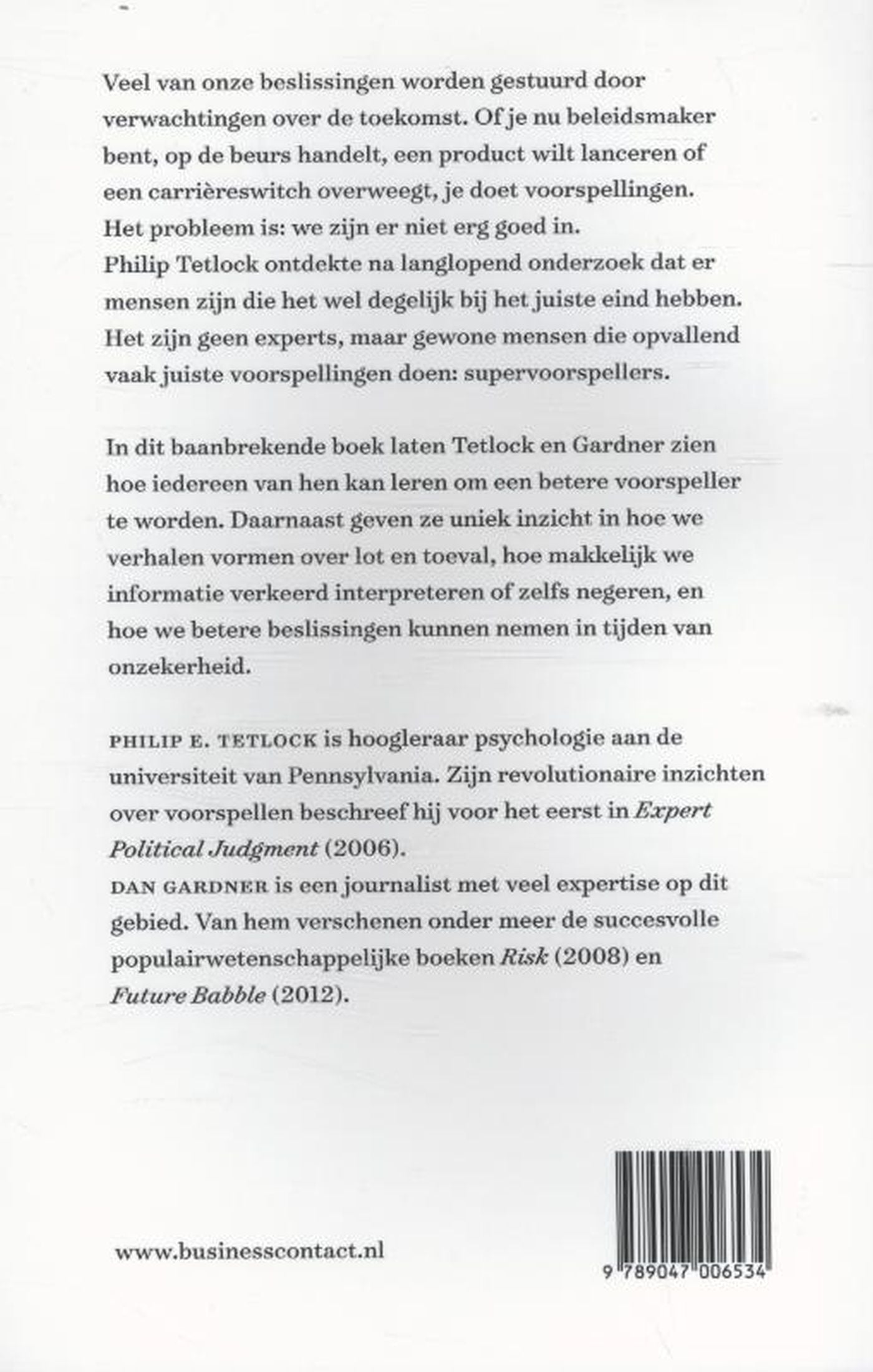 Veel van onze beslissingen worden gestuurd door verwachtingen over de toekomst. Of je nu beleidsmaker bent, op de beurs handelt, een product wilt lanceren of een carrièreswitch overweegt, je doet voorspellingen. Het probleem is, we zijn er niet erg goed in. Philip Tetlock ontdekte na langlopend onderzoek dat er mensen zijn die het wel degelijk vaak bij het juiste eind hebben. Het zijn geen experts, maar gewone mensen die opvallend vaak juiste voorspellingen doen, supervoorspellers. In dit baanbrekende boek laat Tetlock zien hoe je van hen kunt leren om zelf een betere voorspeller te worden. Daarnaast geeft hij een uniek inzicht in hoe we verhalen vormen over lot en toeval, hoe makkelijk we informatie verkeerd interpreteren of zelfs negeren, en hoe we betere beslissingen kunnen nemen in tijden van onzekerheid.
