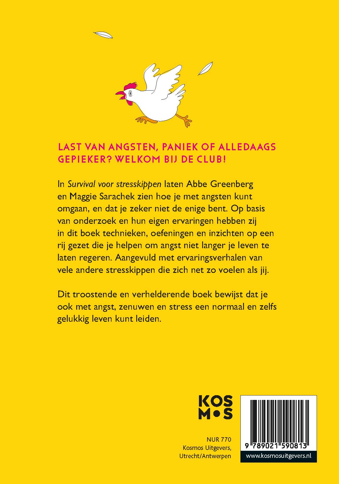 In 'Survival voor stresskippen' laten experts Abbe Greenberg en Maggie Sarachek zien hoe je kunt omgaan met paniek, zorgen, zenuwen, fobieën of malende gedachten die maar niet verdwijnen. Na dertig jaar onderzoek (en intense persoonlijke ervaringen) hebben zij in dit boek effectieve tips en trucs op een rij gezet die je helpen je weer normaal te voelen. Aangevuld met verhalen van anderen die duidelijk maken dat er veel meer stresskippen zijn die zich net zo overweldigd voelen. Zowel troostend als verhelderend.