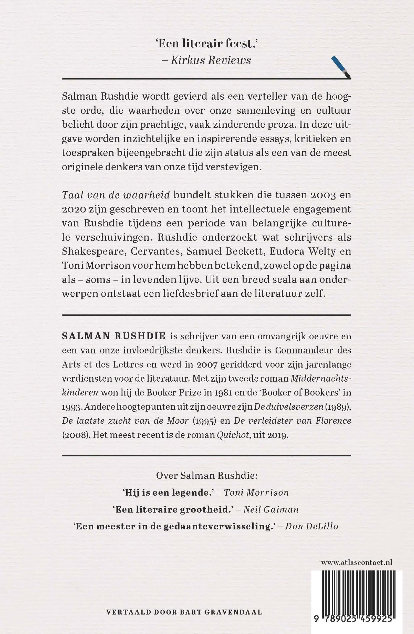 In ‘Taal van de waarheid’ van Salman Rushdie worden inzichtelijke en inspirerende essays, kritieken en toespraken bijeengebracht die zijn status als een van de meest originele denkers van onze tijd verstevigen. Rushdie wordt gevierd als een verteller van de hoogste orde, die waarheden over onze samenleving en cultuur belicht door zijn prachtige, vaak zinderende proza.