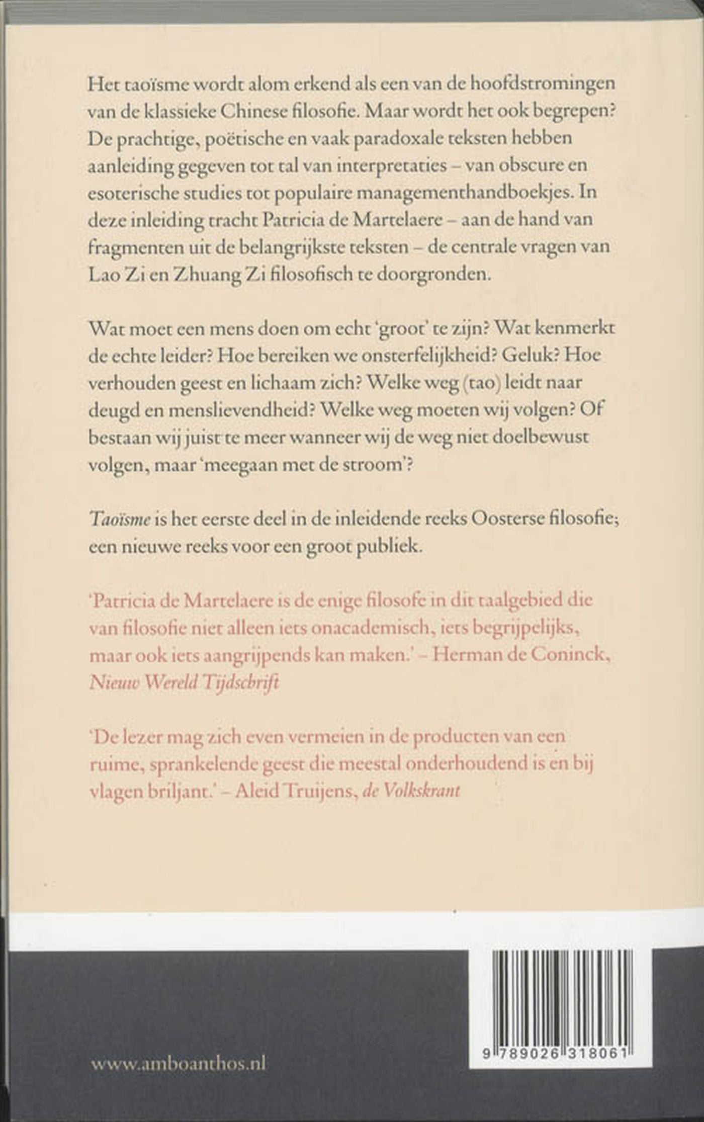 In deze inleiding tracht Patricia de Martelaere aan de hand van fragmenten uit de belangrijkste teksten de centrale vragen van Lao Zi en Zhuang Zi filosofisch te doorgronden.'