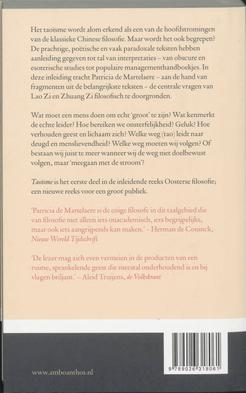 In deze inleiding tracht Patricia de Martelaere aan de hand van fragmenten uit de belangrijkste teksten de centrale vragen van Lao Zi en Zhuang Zi filosofisch te doorgronden.'