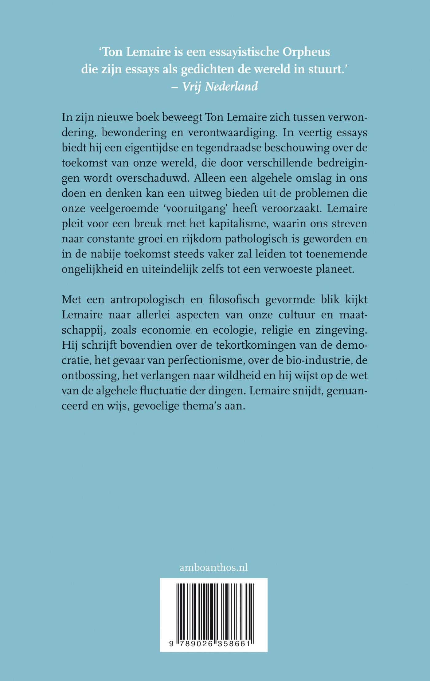 In zijn nieuwe boek Tegen de tijd beweegt Ton Lemaire zich tussen verwondering, bewondering en verontwaardiging. In veertig essays biedt hij in Tegen de tijd een eigentijdse en tegendraadse beschouwing over de toekomst van onze wereld, die door verschillende bedreigingen wordt overschaduwd. Alleen een algehele omslag in ons doen en denken kan een uitweg bieden uit de problemen die onze veelgeroemde ‘vooruitgang’ heeft veroorzaakt. Ton Lemaire pleit voor een breuk met het kapitalisme, waarin ons streven naar constante groei en rijkdom pathologisch is geworden en in de nabije toekomst steeds vaker zal leiden tot toenemende ongelijkheid en uiteindelijk zelfs tot een verwoeste planeet.